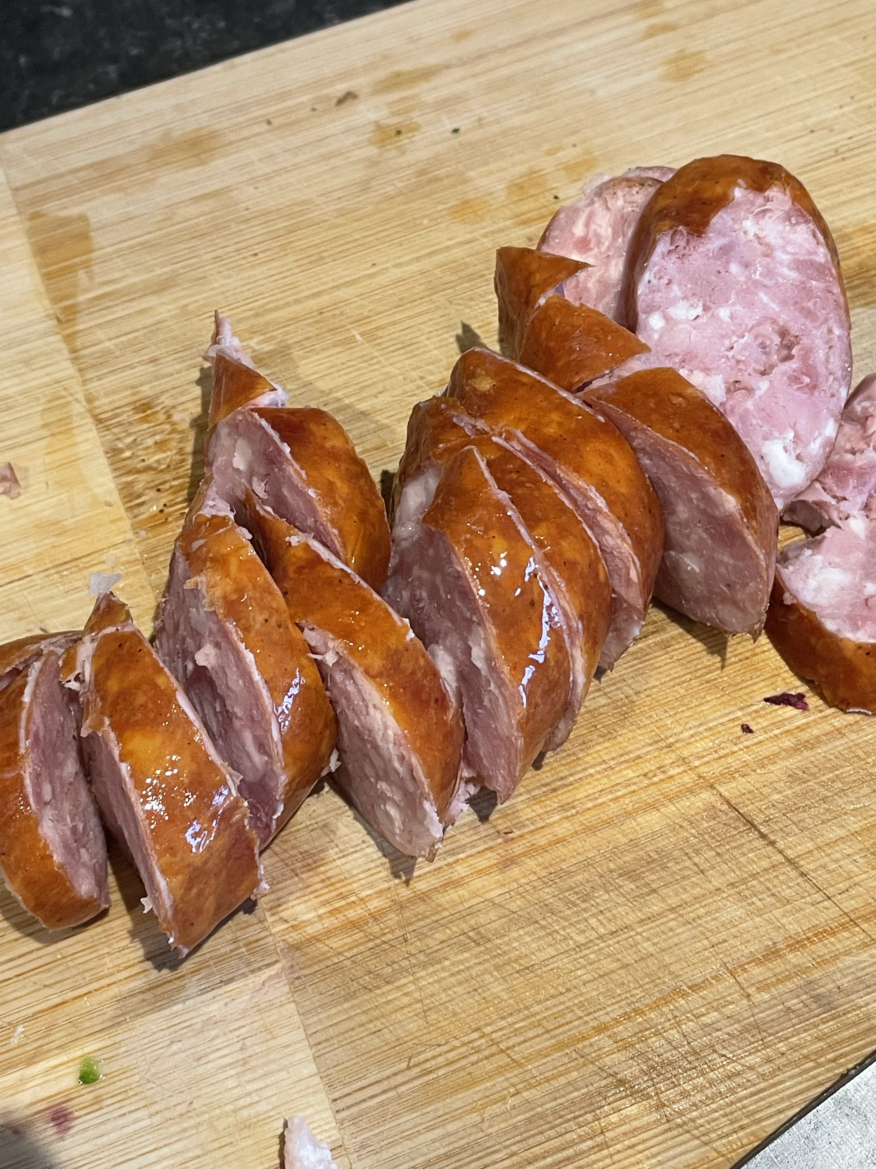 - Add the bacon lardons and the sausage to the pan until all cooked through.