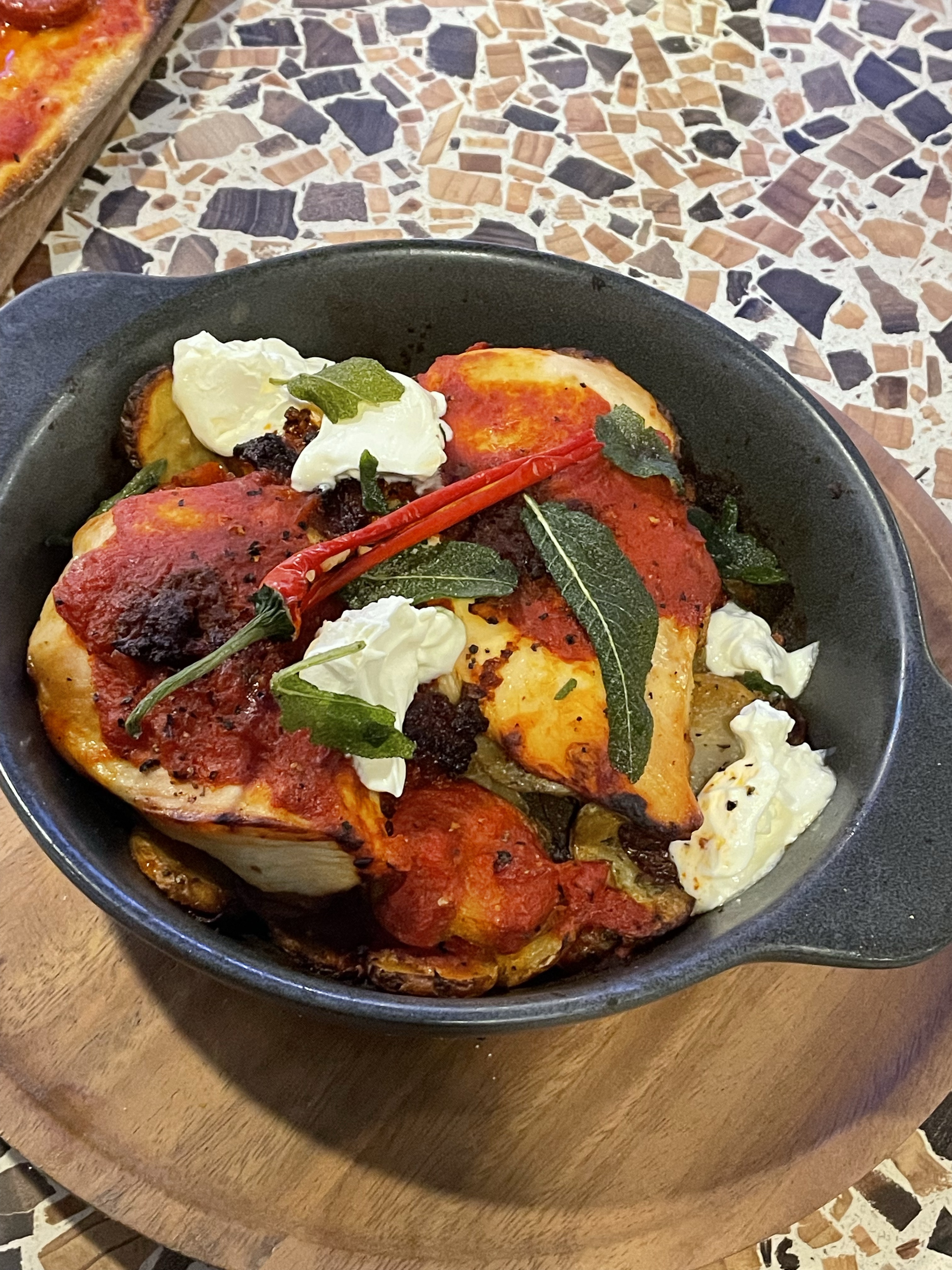 For the main courses we could choose from a limited selection of pizzas, pastas & other meals on offer on their usual menu. Ben enjoyed a whopping RUSTICA HOT POTATO & CALABRIAN SAUSAGE pizza; Calabrese sausage, spicy ‘nduja sausage, sliced rosemary potatoes, roasted red onion, roasted peppers, mozzarella and riserva cheese. This was a very large pizza but was divine. I had the CHICKEN CALABRESE; Oven-roasted chicken with a harissa marinade in a roasted pepper, tomato & spicy ‘nduja sauce. Served with potatoes, roasted red onion and mascarpone. This was a really colourful fresh and tasty dish. I wouldn’t say this was spicy, but a really filling and comfort food dish. At this point we were so full, but…