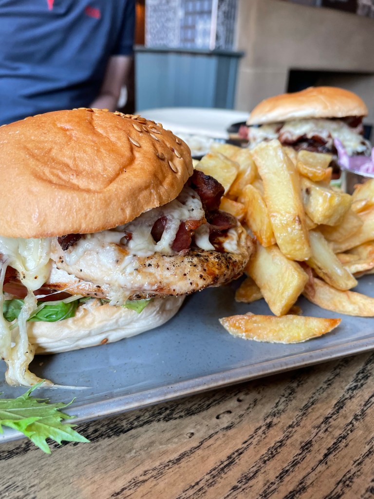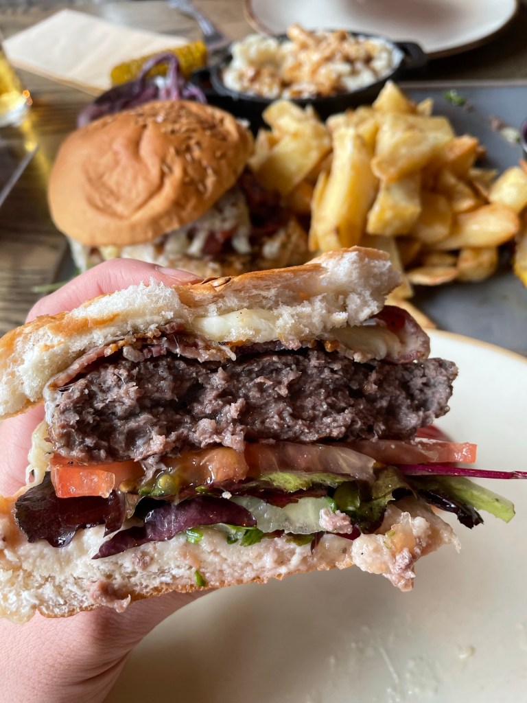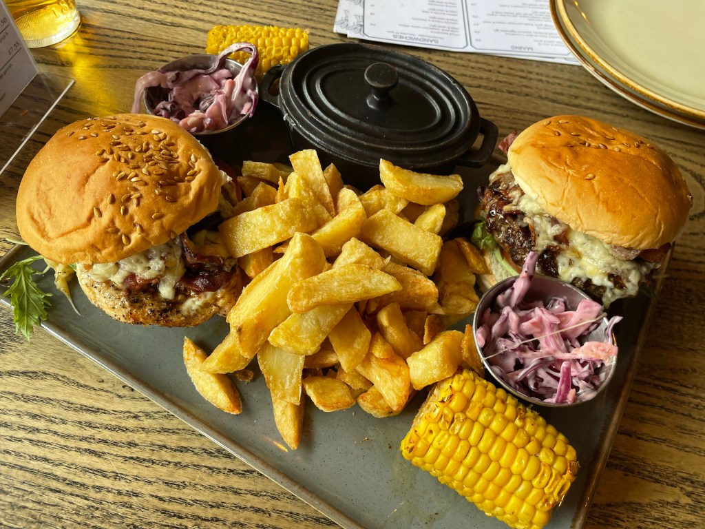 Our second visit to The Wheatsheaf was after a lovely and sunny 6 mile walk (again on a Sunday) and it was just the spot to get some comfort food! The outside seating was very busy but inside there were tables to spare thankfully. We were both fancying burgers so when we saw the Sharer Burger Board on the menu, this was perfect for 2 hungry people and great value for money at £28.