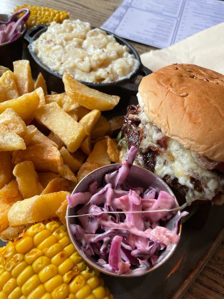This consisted of; two burgers – beef or chicken with salad, bacon & cheese or two vegetarian burgers, mac ‘n’ cheese, fries, slaw & corn on the cob (vo, gfo). We got one of each of the chicken and beef burgers both of which were cooked beautifully and a good sized burger. The fries were more like chippy chips which we love, and the mac ‘n’ cheese was definitely homemade. Everything was delicious and very filling indeed, you wouldn’t need any more between 2 people – another meal here highly recommended.
