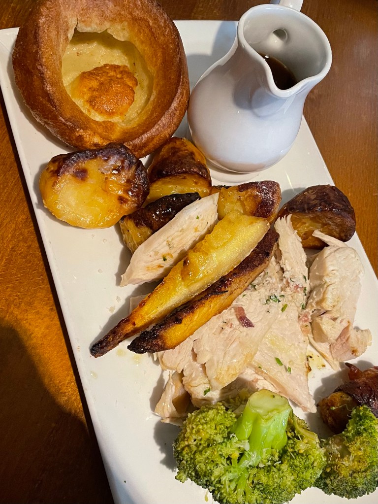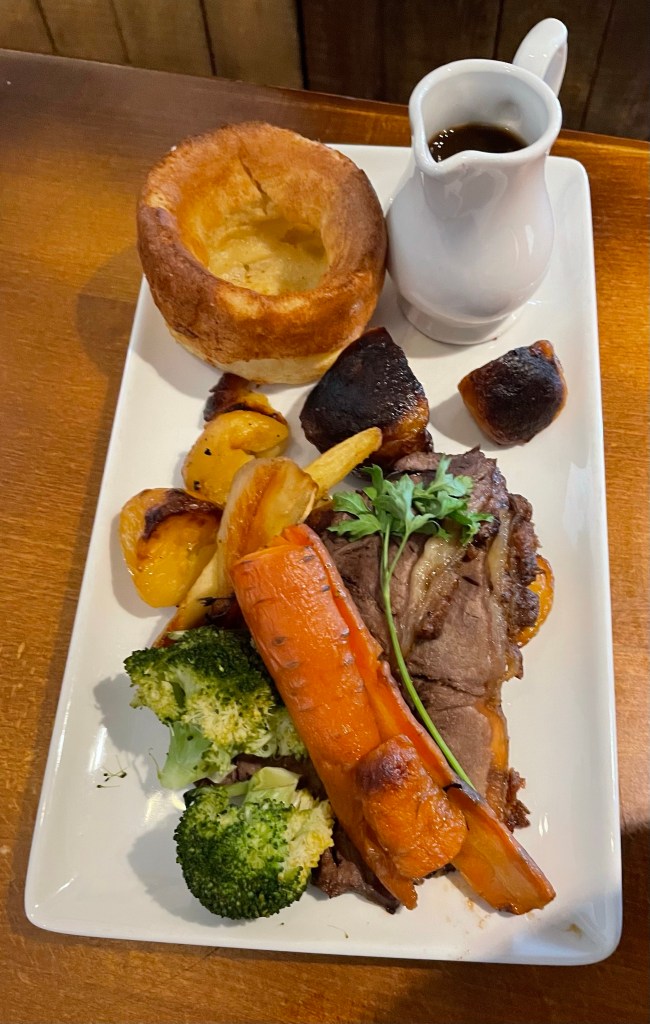 The pub’s menu may vary and refresh every so often but on the Sunday Roasts offer was a choice of either Sirloin of Beef, Turkey Breast (with stuffing wrapped in bacon & a pancetta crumb), Pork Belly (with stuffing wrapped in bacon & crackling) or a Trio of all three and of course there’s a Vegetable Roast option too. Each dinner comes with beef dripping roast potatoes, Yorkshire Pudding, thyme-roasted carrots, broccoli, honey-roasted parsnips and gravy. The dinners are priced roughly between £13 – £16 and you can add extras at an additional price.