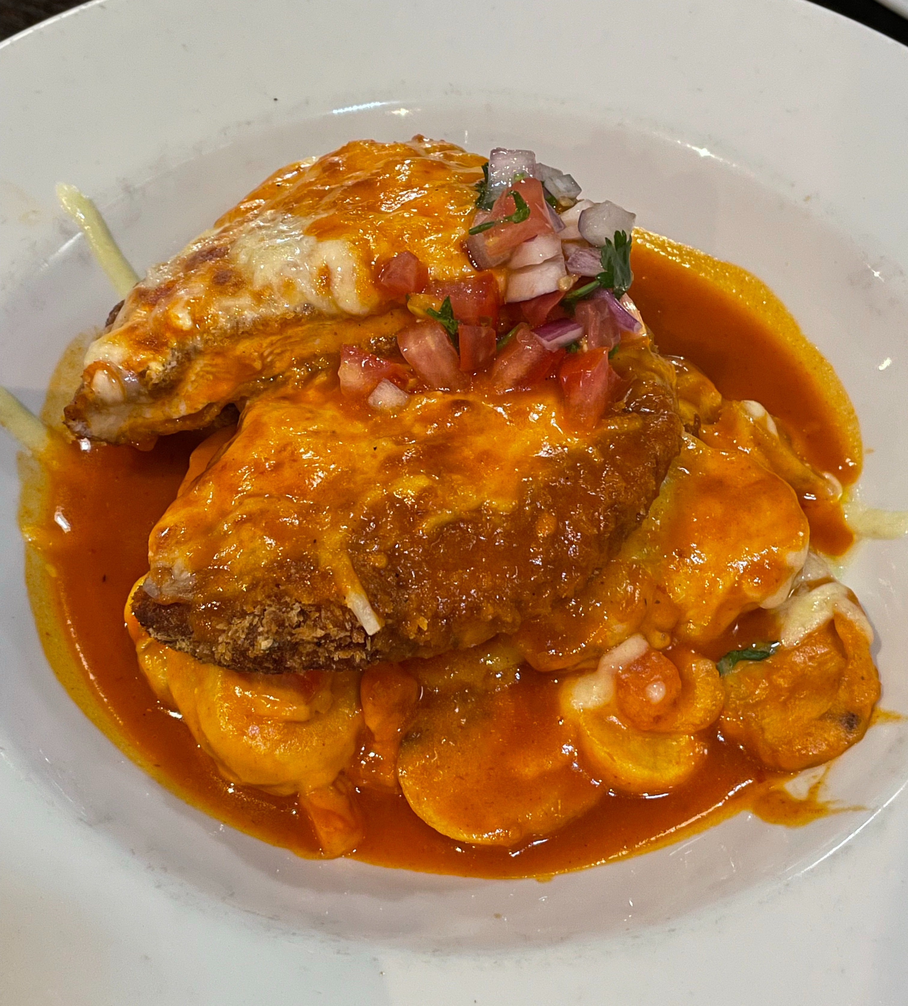 Our delicious mains were; Lamb Fajitas; strips of meat and peppers cooked with seasoning and served sizzling on a skillet, served with 2 tortillas, corn chips and 3 sauces – the lamb was particularly seasoned well and tasted gorgeous. A traditional Mexican dish and these were a treat to have with corn chips in, something that we wouldn’t usually think to add but DEFINITELY adding when we make our own in the future. Ben really enjoyed these. I had the Chicken Poblanos; Crispy coated chicken served on gratin potatoes, topped with cream cheese and melted cheese, served in a tangy tomato sauce with salsa – something totally different to what I’d had from a restaurant before and I really enjoyed it. Comforting, cheese and very filling.