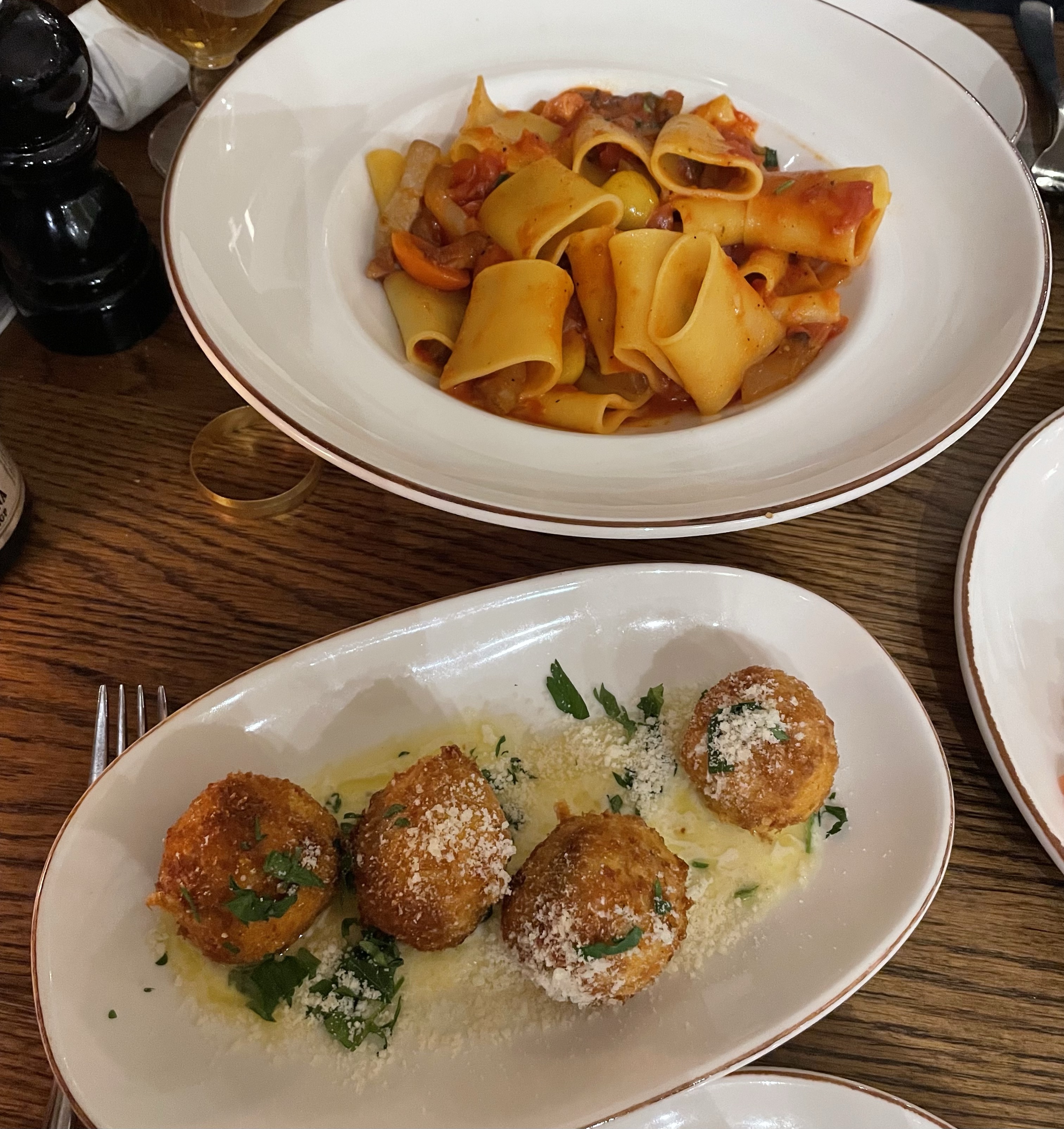 For “starters” we shared the Bruschetta al Pomodoro and Arancini Alla Carbonara. The bruschetta was nice, not the best I have had though. The tomatoes were cut really small and the bread thin so the topping just fell off the bread and it was very messy to eat. I wasn’t getting the juiciness and freshness that I expected. The arancini were faultless though, really good and delicious.
