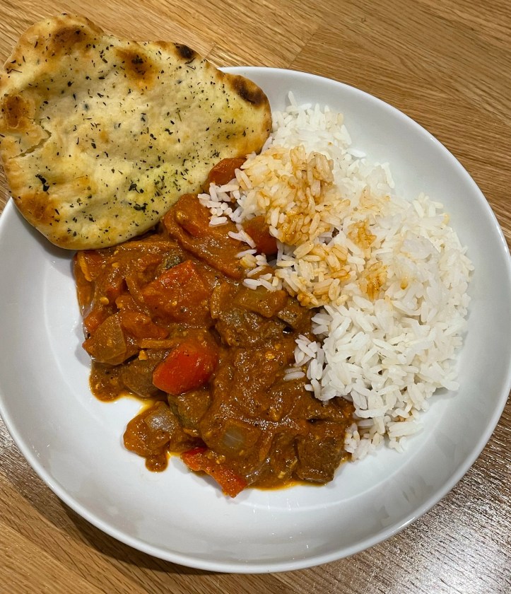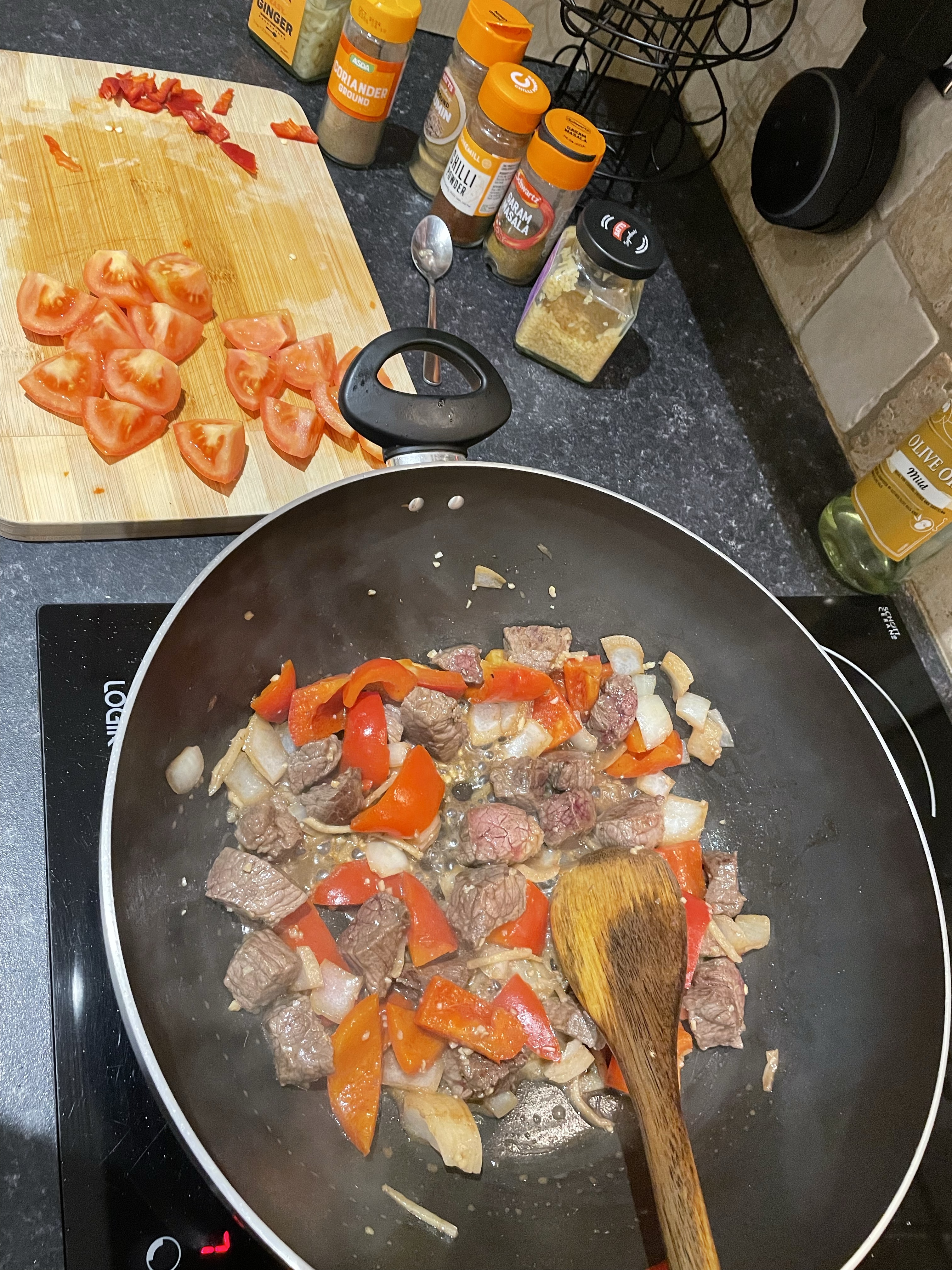 A karahi is a type of thick, circular, and deep cooking pot that originated in the Indian subcontinent. Curries prepared in a karahi are more of a stew consistency and include chicken, beef, mutton (goat) and lamb and Karahis prepared with paneer or tofu are becoming increasingly popular amongst vegetarians. A karahi based dish is a popular late-night meal in Indian and Pakistani cuisine. For a very close take on this cuisine you can use a large, deep wok or frying pan as I did. I decided to choose beef too and the rich taste made this curry extremely tasty and comforting. Using all of the staple curry ingredients this made a perfect Saturday evening curry!