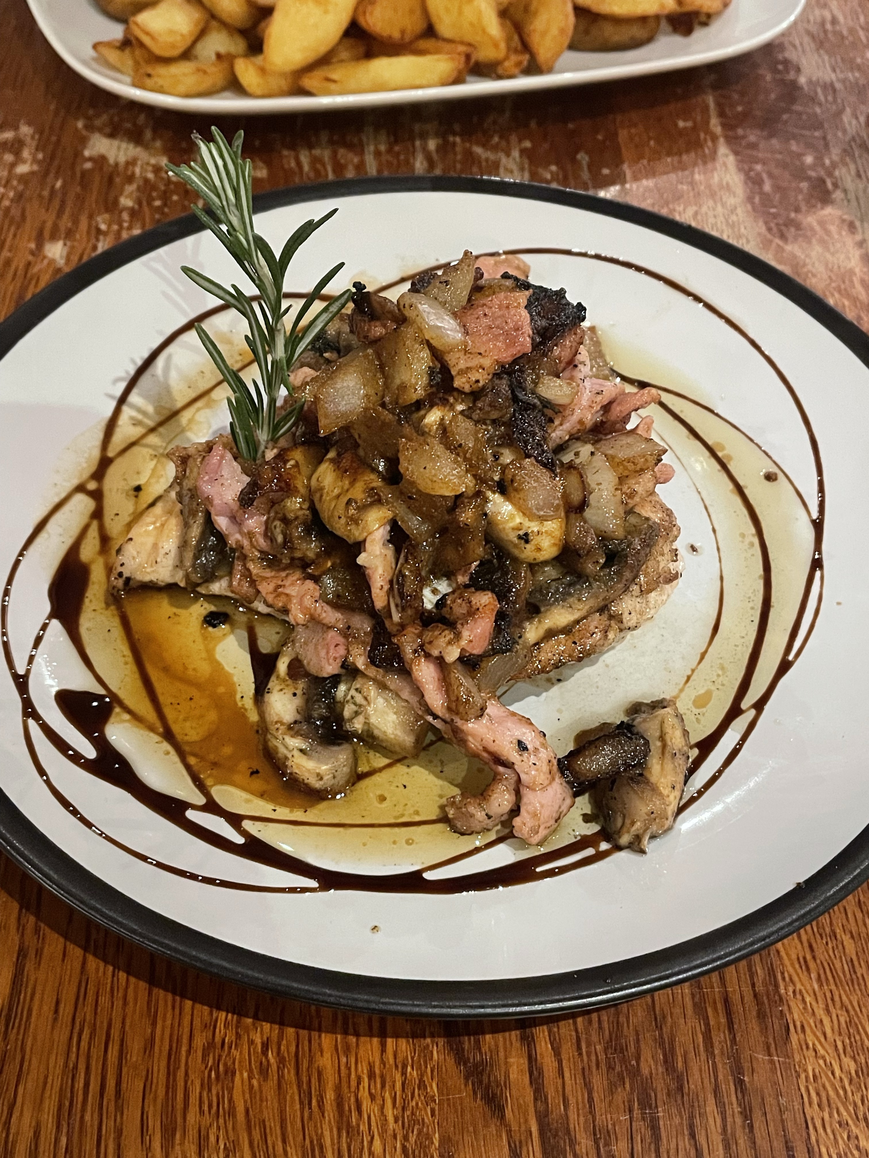 - Chicken Forestiere – Chicken Breast Smothered in Bacon, Shallots & Mushrooms, finished with Garlic & Basil – I was torn between this and the Thai Chicken Breast but we eat a fair bit of Thai at home so I went with this. A really beautifully plated bit of food, again there was a lot of it and was served with new potatoes and vegetables (way too much for me to finish). The garlic and basil was strong on this dish which I loved.