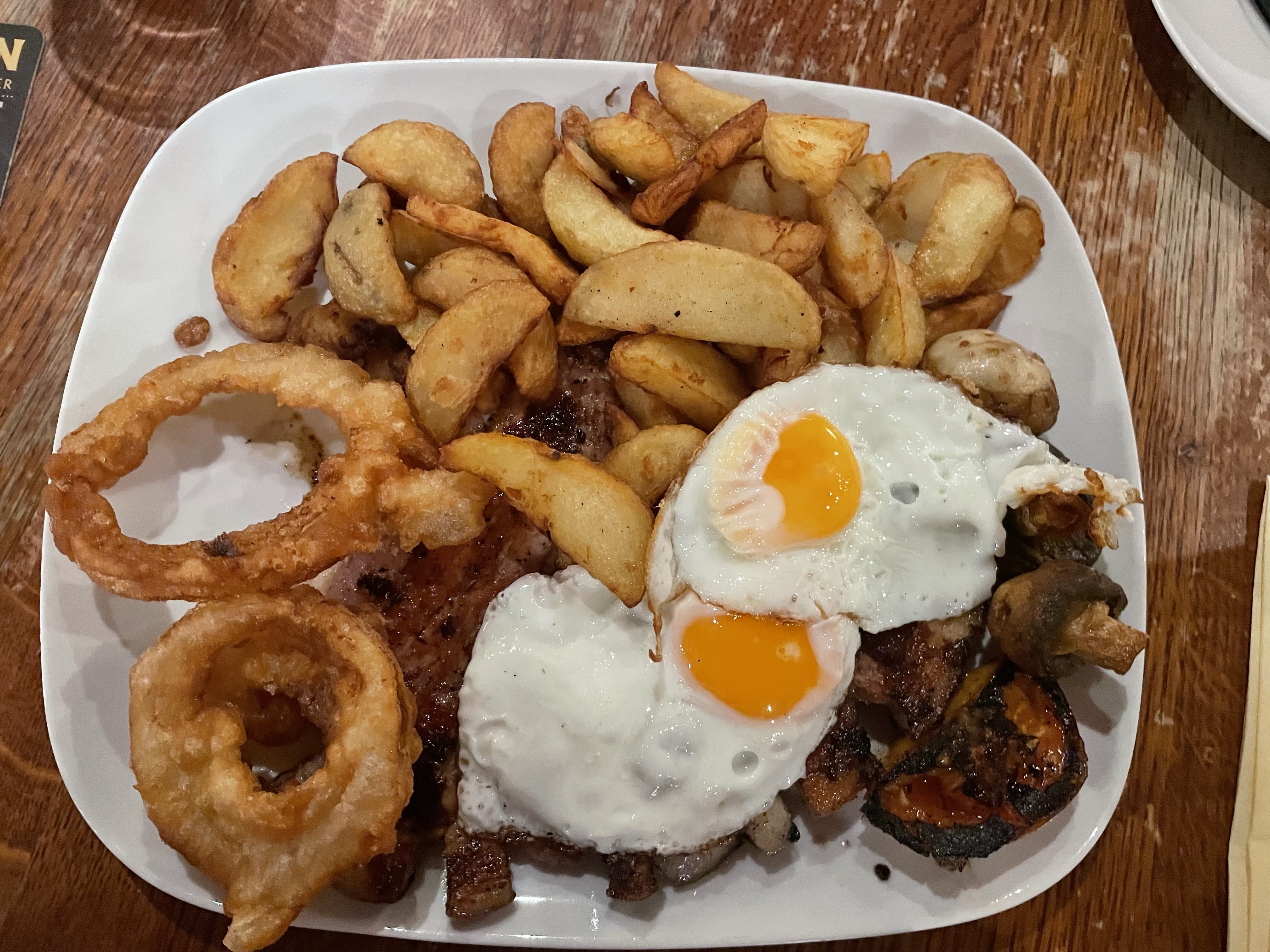 - 10z Gammon with Two Fried Eggs, Onion Rings, Tomato & Mushrooms served with chips – talk about large plate of comfort food! Ben really enjoyed this, PROPER pub grub and definitely filling.