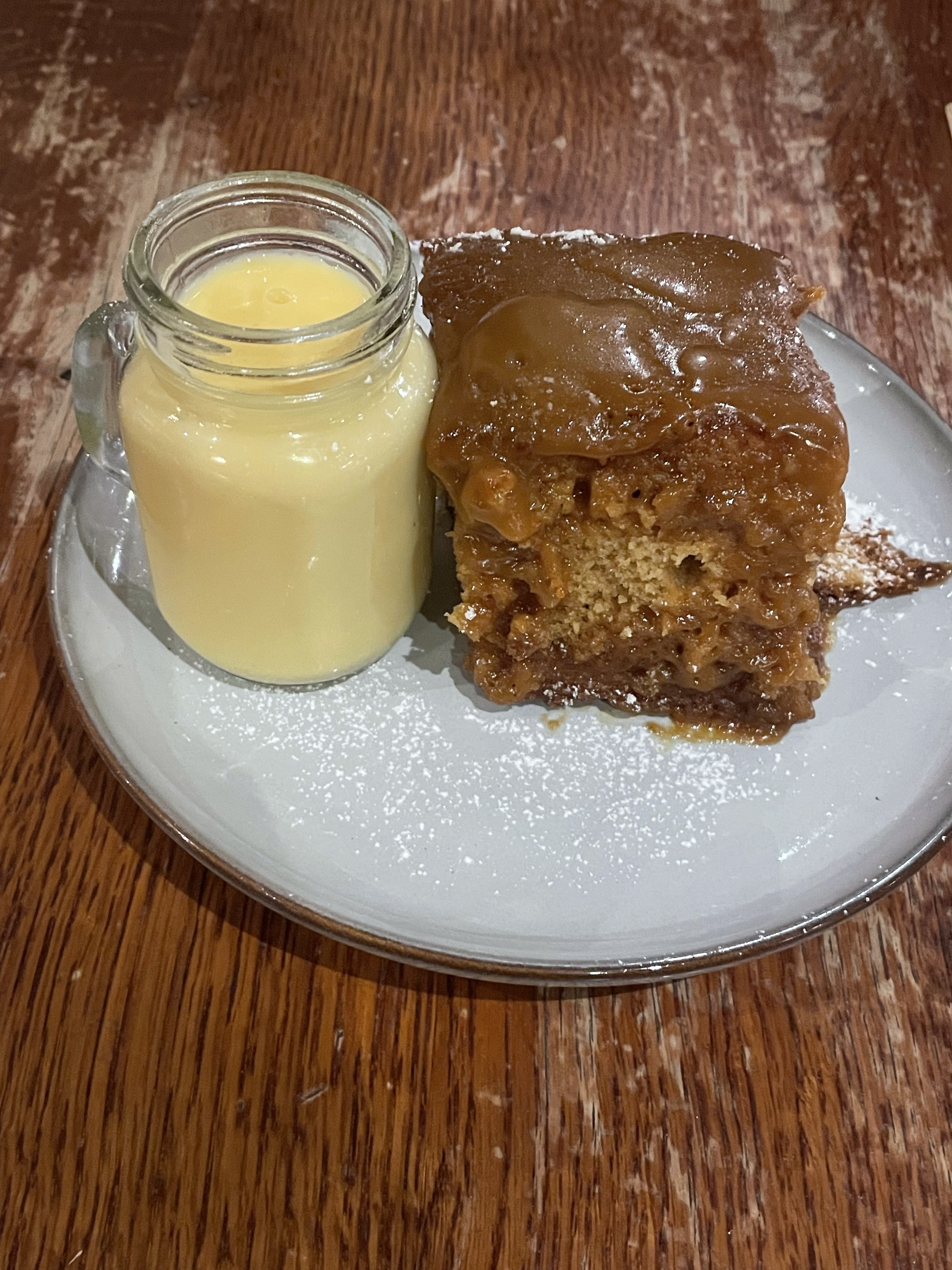 - Homemade Sticky Toffee Pudding (v) served with custard, pouring cream or ice cream – I had the custard again because they make it so rich and creamy here. The wedge of the pudding was great, it was more a tasty sponge than sticky toffee but my dessert belly managed to fit every last crumb in. Beautiful.