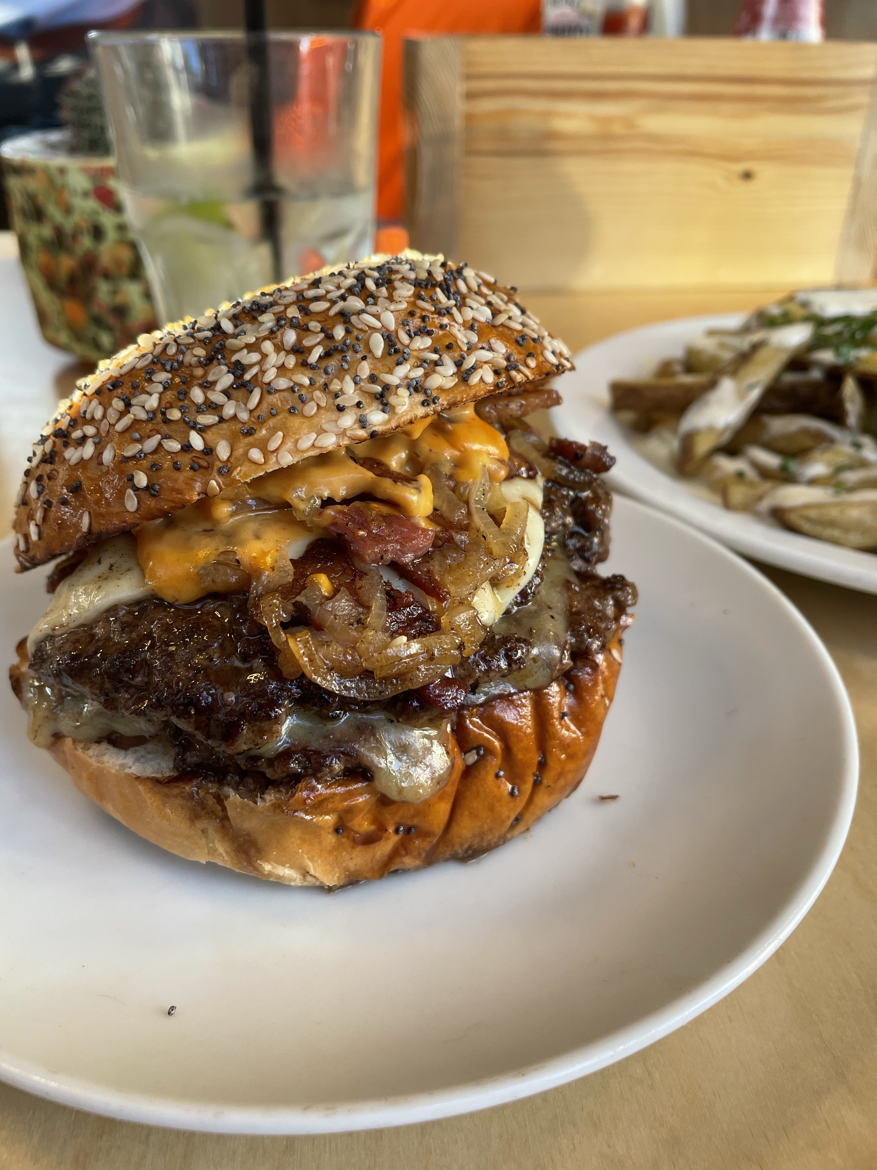 • BOB (Beef Onion Bacon) Burger £10.40 – 2 x Smashed Beef Patties, Maple Bacon Onion Jam, Emmental, Monterey Jack, Burger Sauce, Potato Brioche – because the burger wasn’t massive, it wasn’t too messy to eat which is good seen as we were going out after, but everything was very tasty and went well together. My burger was a little pink inside which I didn’t mind. and I preferred that there was bacon bits, rather than big, fatty streaks of bacon which I am not fond of sometimes. A fulfilling, yummy burger.