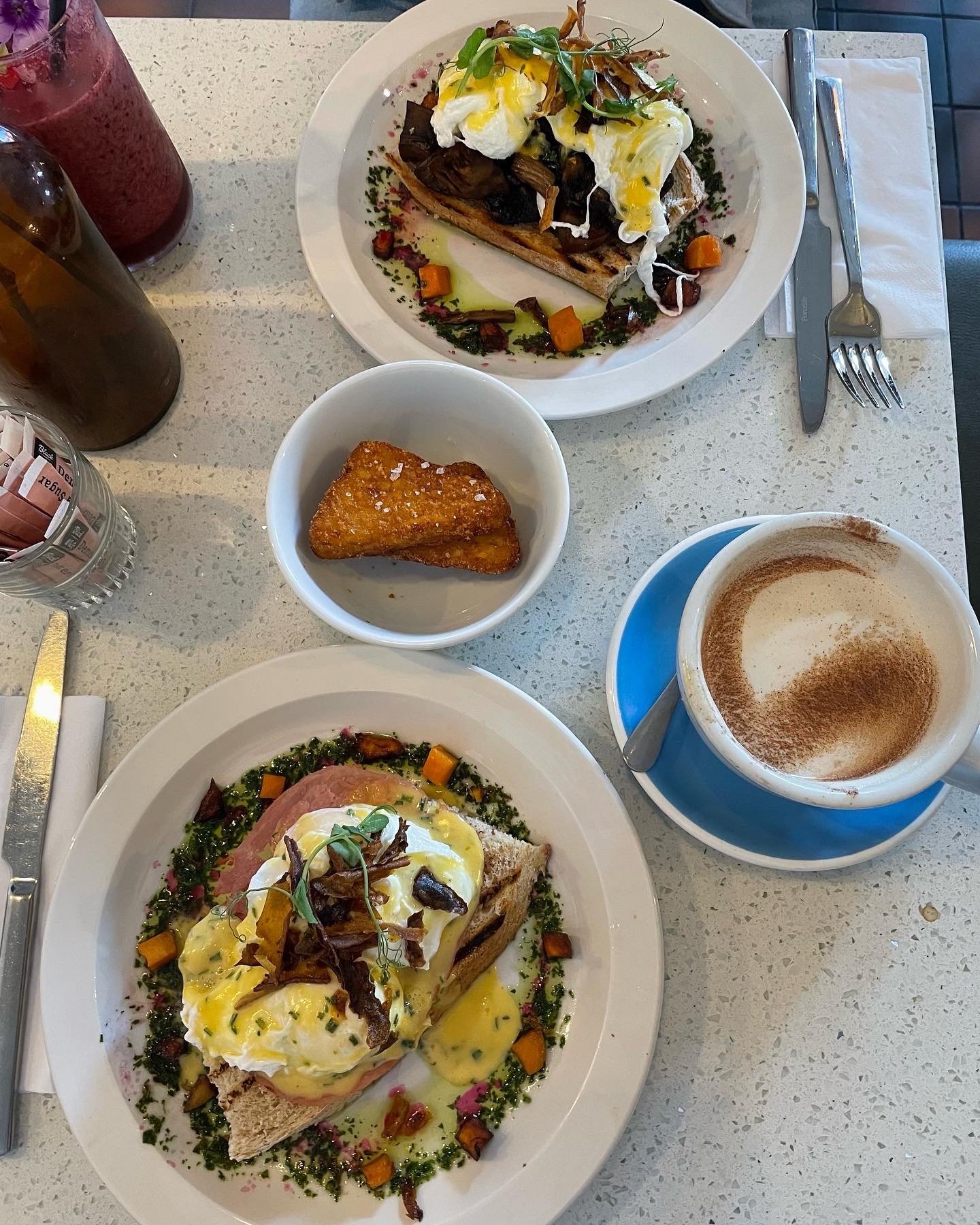 - I went with the EGGS BENEDICT; roast ham and soft poached eggs on sourdough bloomer topped with chive hollandaise and roasted sweet potato. The eggs were perfectly runny (check out my Instagram post here for that perfect egg yolk pop!), the sweet potato was a nice touch and I loved the salsa around the plate too! A very yummy brunch.