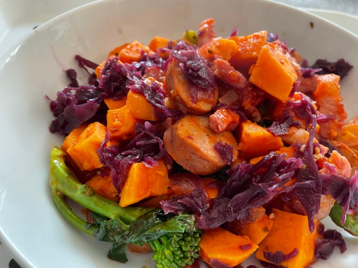 - Once the sauce has thickened and the broccoli is at a nice texture, add in the sweet potato and give everything a good mix up until warmed through.