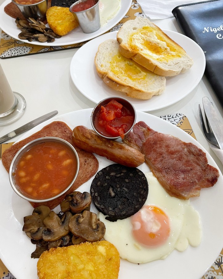We did a bit of “swapsies” with some ingredients so nothing went to waste, I don’t like black pudding or spam so I had Mum’s tomatoes and beans instead, and we ordered some extra bread to mop it all up 🙂