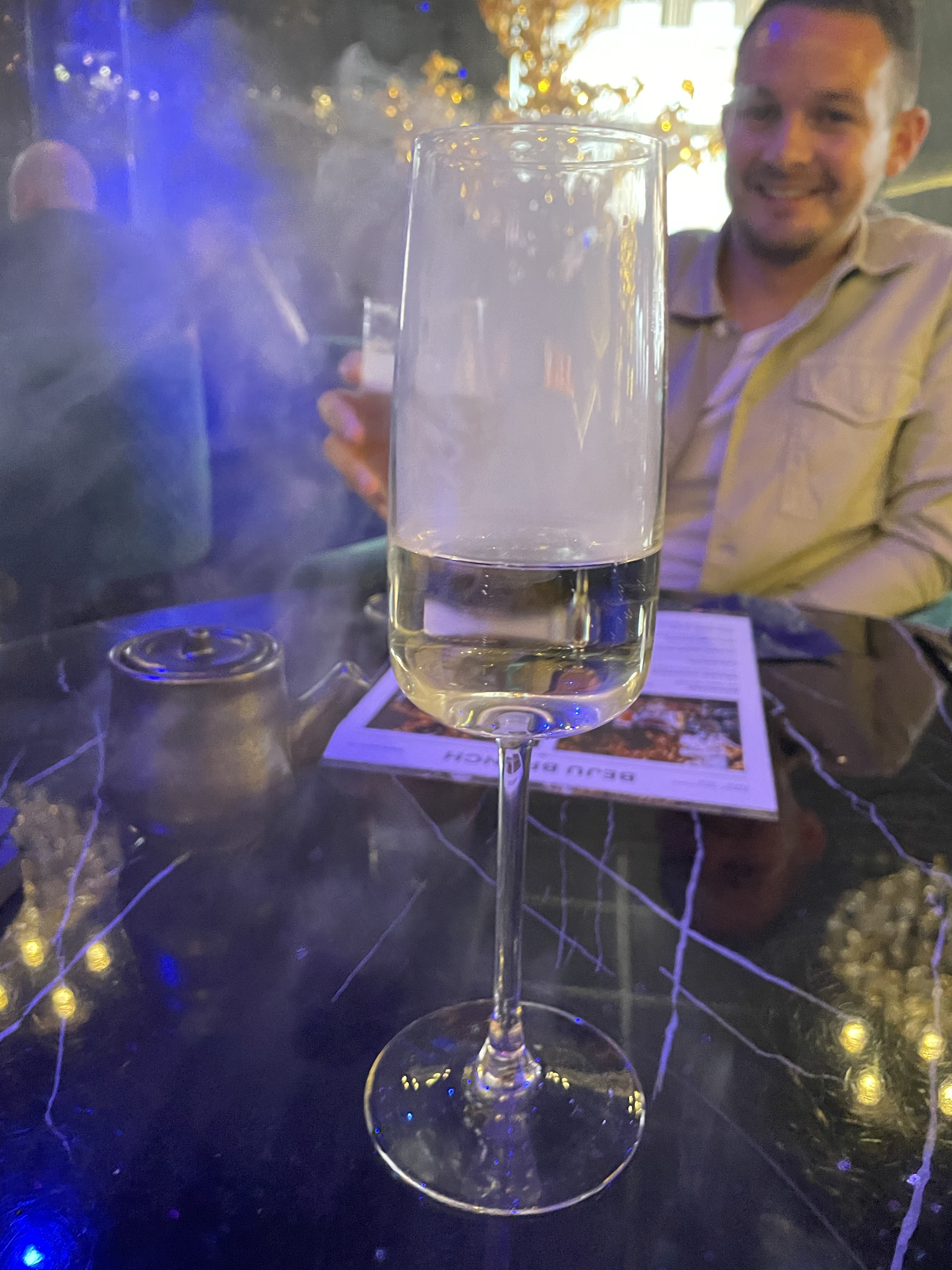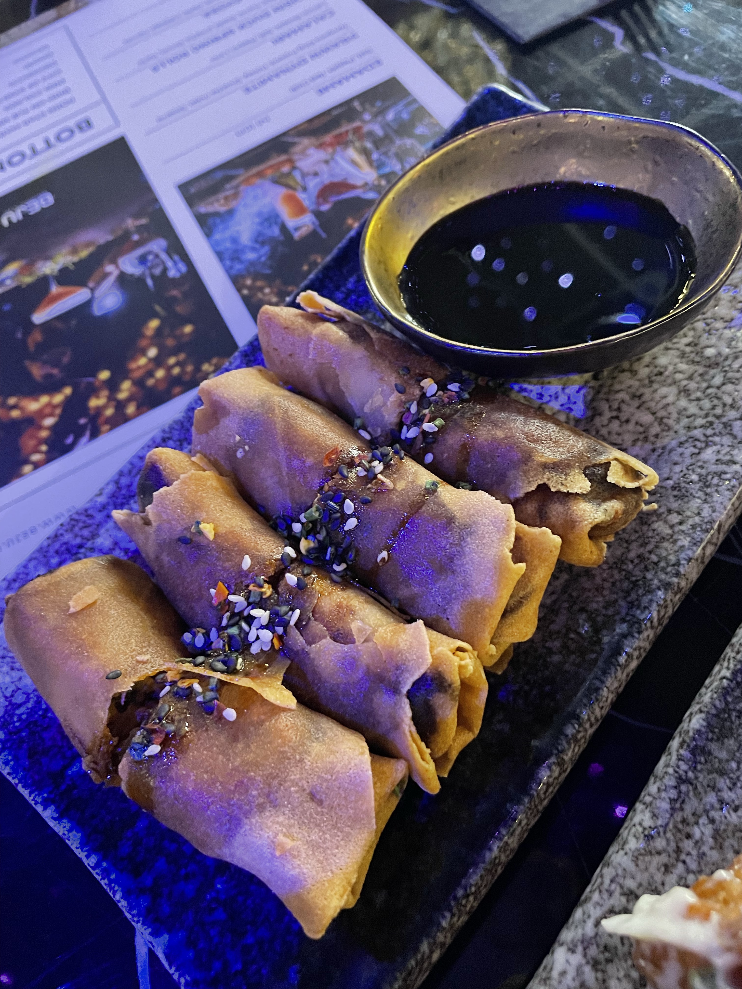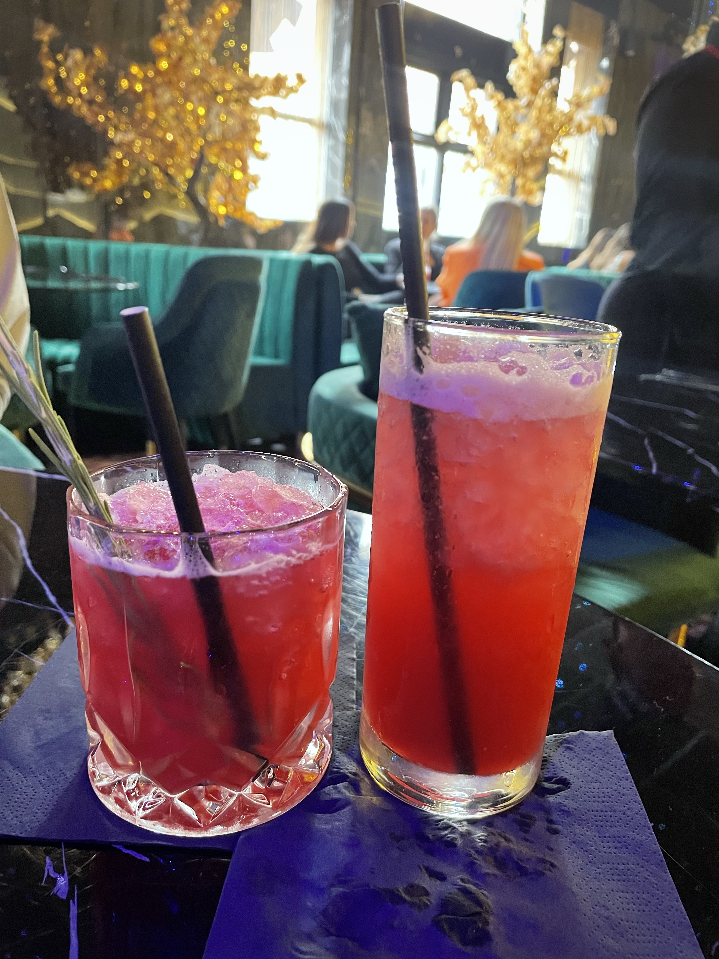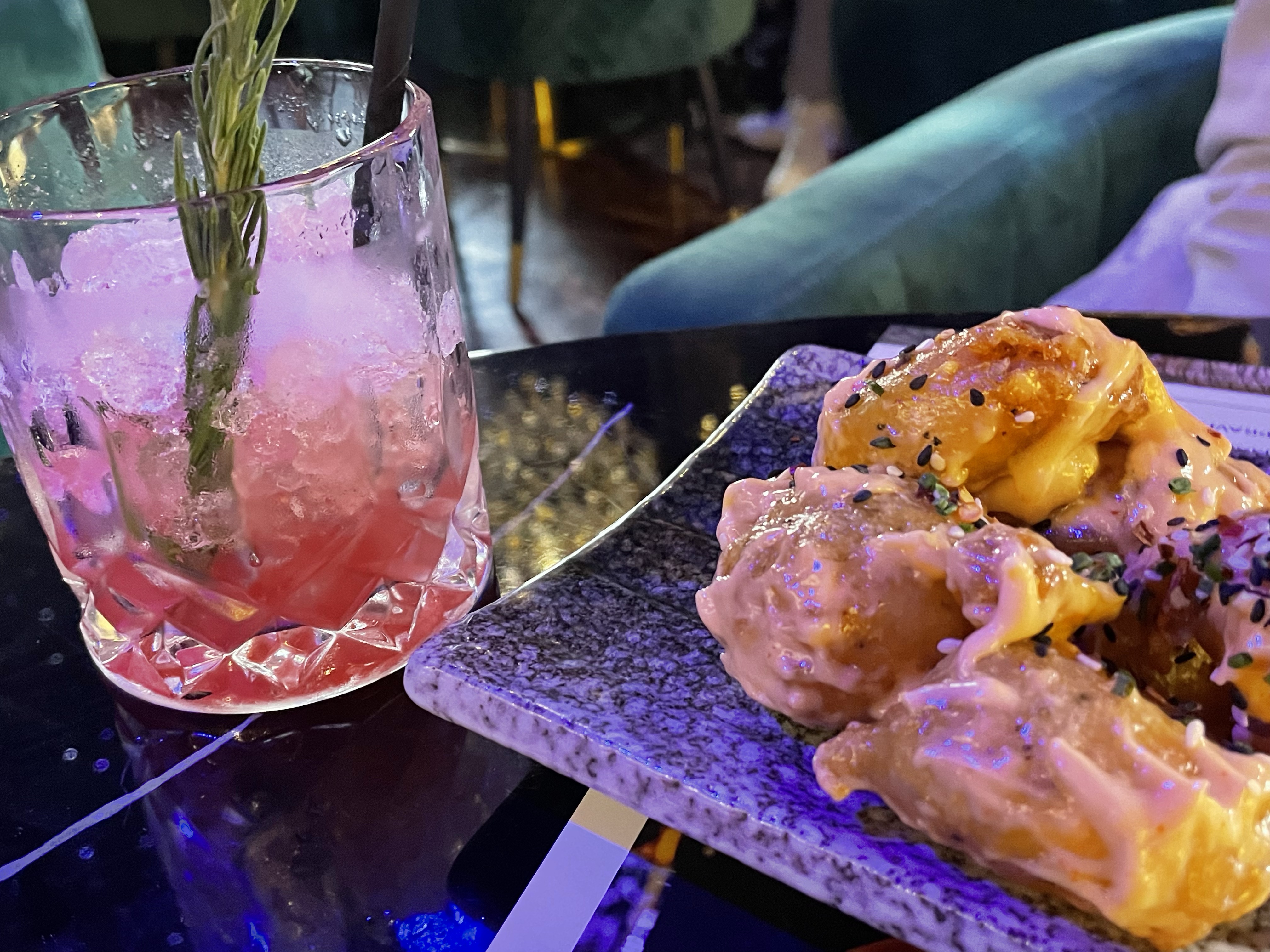 Walking in we were greeted by friendly staff and straight away shown to our table. The atmosphere was buzzing and the décor is definitely memorable with dark hues and unique decorations and lighting that make the room look luxurious. There was a DJ on playing a lot what I call “music without words” – but as our time there went on, more recognisable songs were played which I think adds to a bottomless brunch experience. There is definitely a “bougie” or what I may call “posey” vibe about this place… In all honesty, I wouldn’t intentionally visit here on a night out, but we really enjoyed the Bottomless Brunch and would recommend it (at the discounted price).