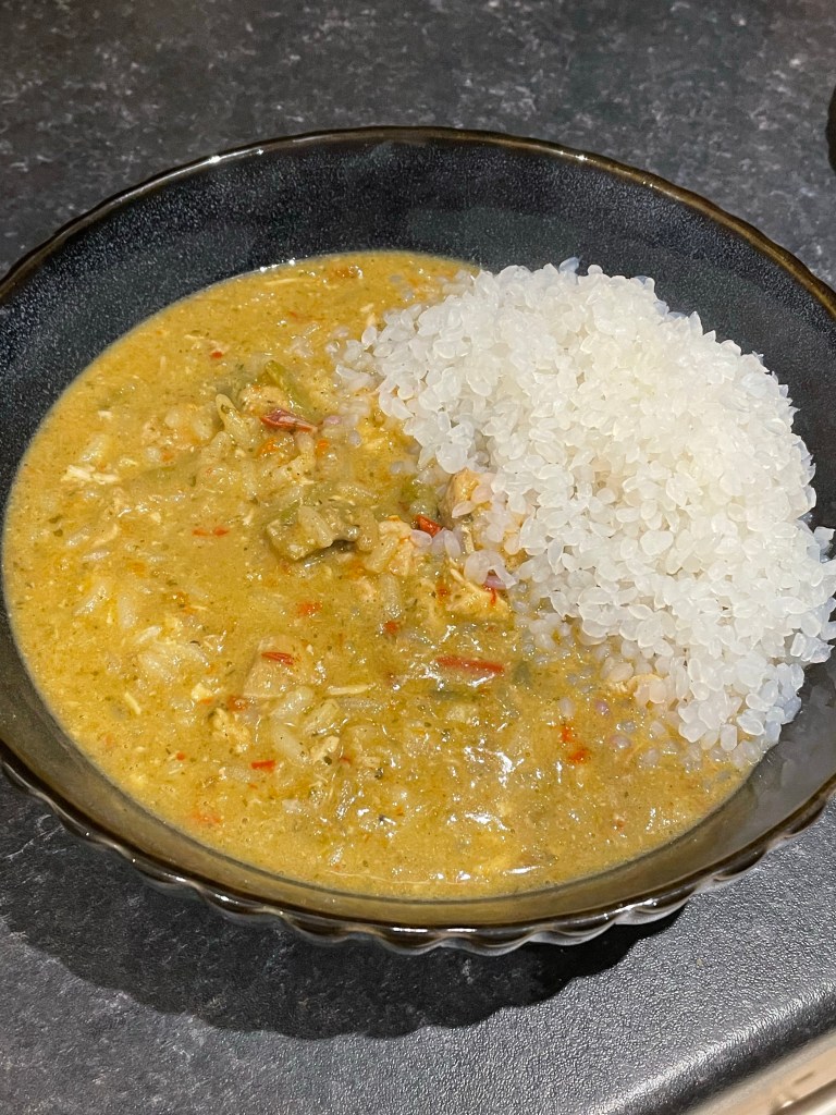 The rice is made from Konjac powder, water & citric acid. Konjac powder is gluten free, full of fibre and known to contribute to weight loss. The rice was a slightly strange jelly like texture, I wouldn’t substitute the rice that I usually buy for this because of that and because of the price, but nevertheless it was a good contribution to the curry and I can see that it’d be a good option for those looking to restrict their calorie intake.