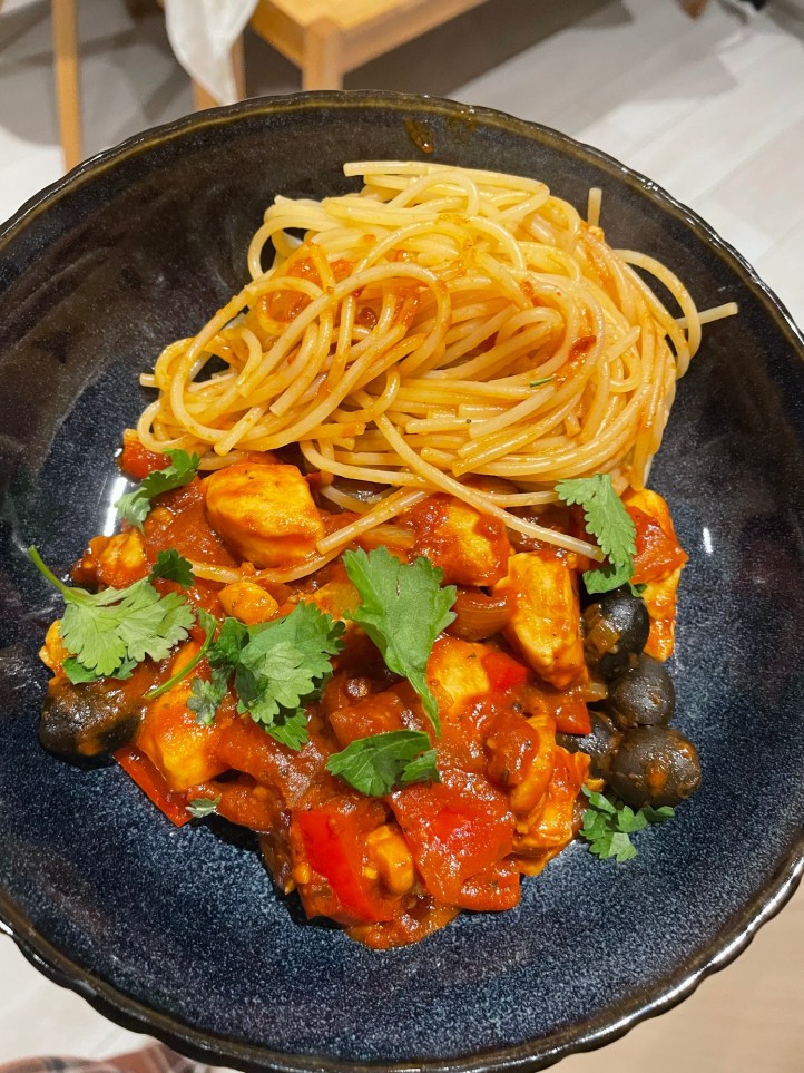 - Add the chicken back into the pan and mix in the sauce and let this simmer whilst you cook your spaghetti to packet instructions (about 10 mins).