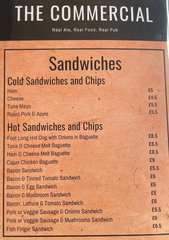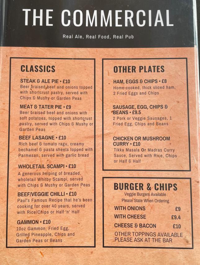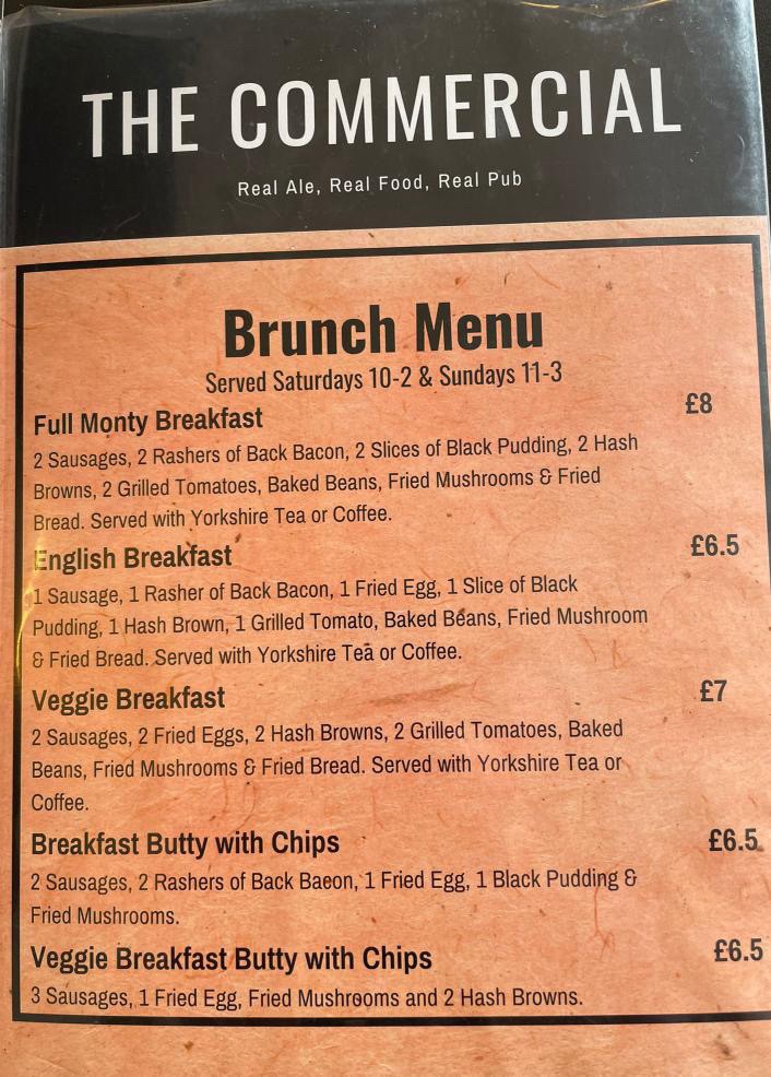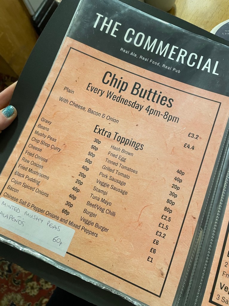 The Commercial also started Sheffield Distillery which is onsite where they create their own selection of Gins and Vodkas or which you can enjoy at the pub, or buy to take home. Plus not only are their Chip Butties something to rave about, but they have a decent pub grub menu served daily (menu sample below) and do various specials as well. The Commie is a very traditional pub scene and has a local but welcoming atmosphere.