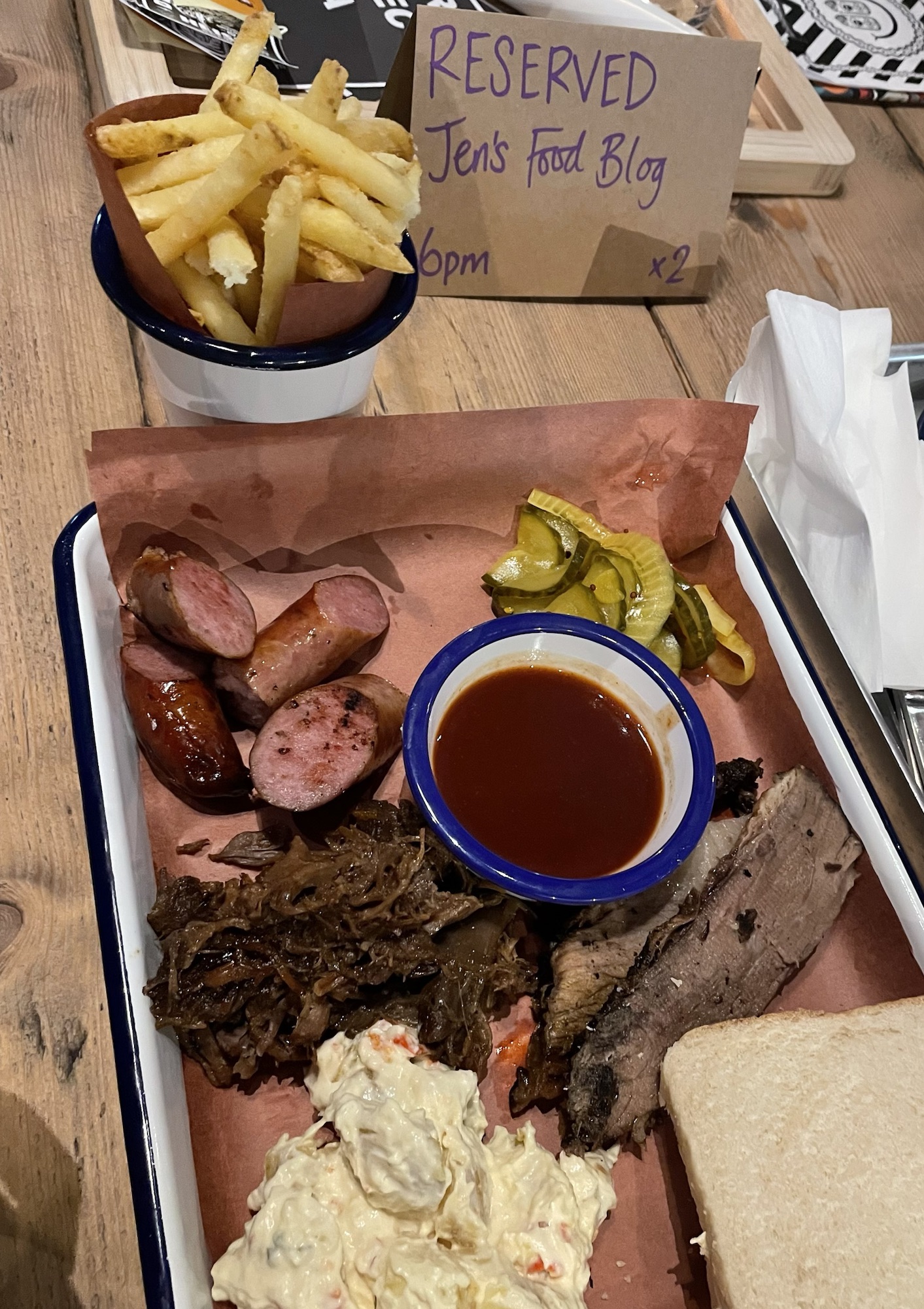 - Smoked Meat Tray 1 (Beef Shin, Brisket & Smoked Sausage (sourced from local Pipers Artisan Sausage – all smoked in-house) with pickles, potato salad, bread & BBQ dip – a heavenly plate of Smokey goodness, we particularly enjoyed the sausage.