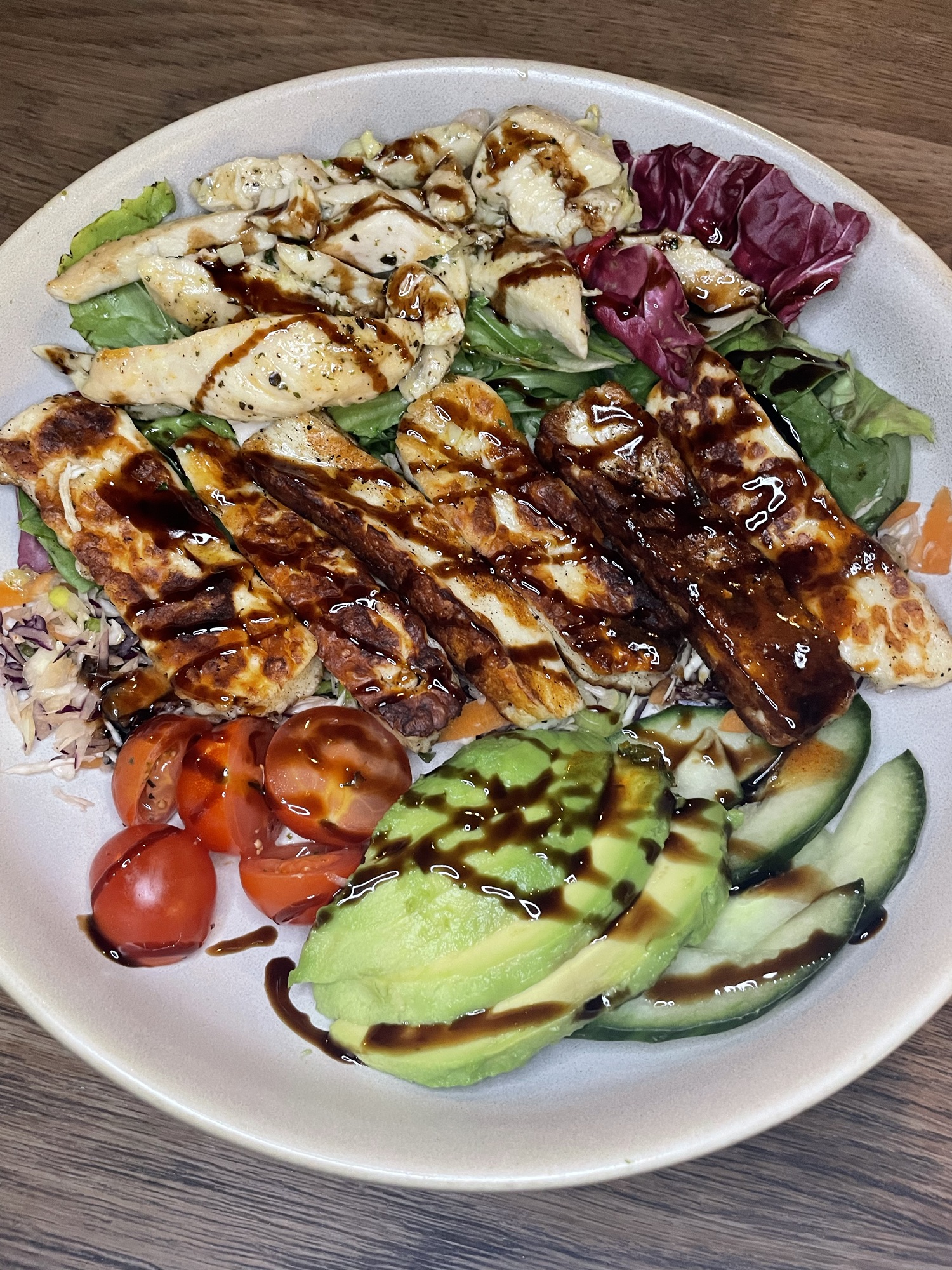- Halloumi Salad (V, GF); Grilled halloumi, avocado, tomato, cucumber & mixed leaf salad, dressed with balsamic glaze. I also added Garlic & Herb Chicken – SO MUCH halloumi and chicken!! The chicken was reallllly garlicky (we do love garlic so that didn’t hinder our date haha) it was fabulous. A really fresh meal (£10.50+£2)