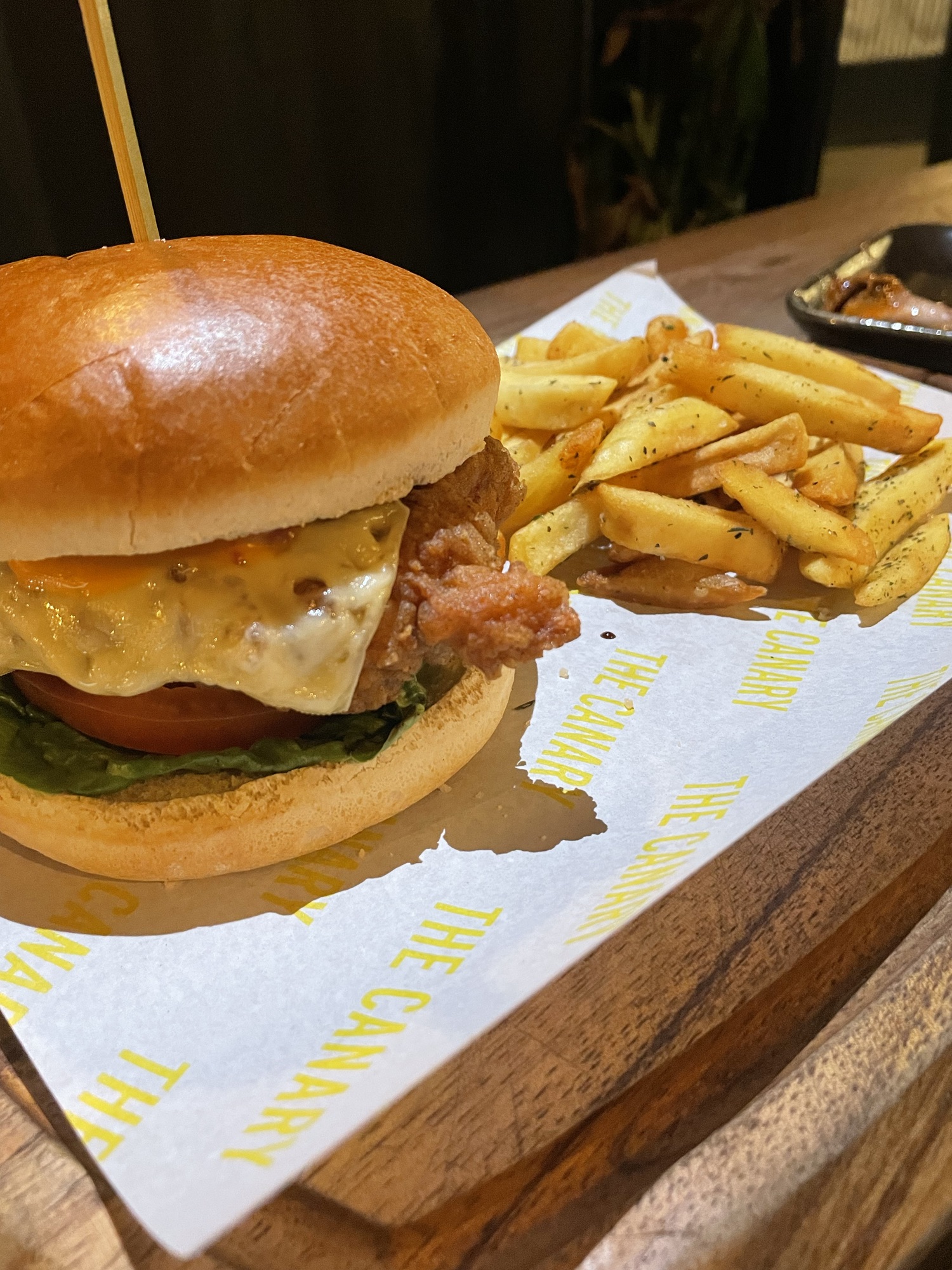 - Buttermilk Chicken Burger; Spiced buttermilk chicken breast, Swiss cheese, gem lettuce, tomato & spiced slaw, served on a brioche bun with House Fries – a decent portion, very tasty, not too messy but still hits the spot (£12)