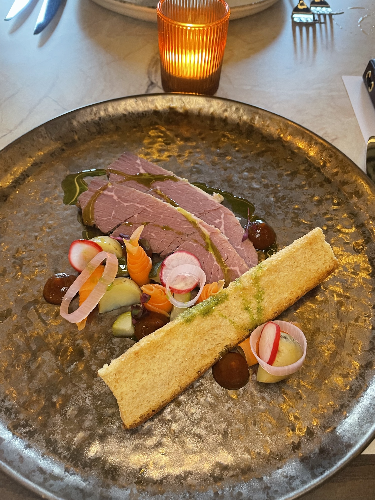 - HOME CORNED BEEF BRISKET pickled vegetables, Heritage potato, brown sauce, sourdough crisp