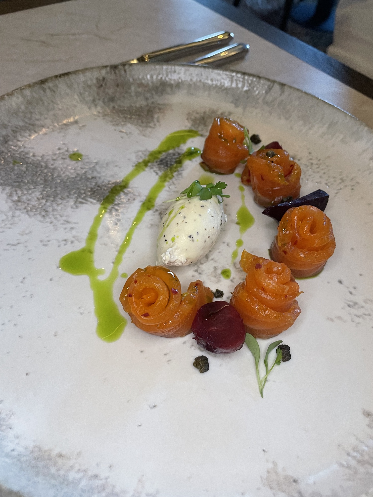 - CHILLI & CITRUS CURED SALMON (GF) roasted beetroot salad, baby watercress, crispy capers, peppered cream
