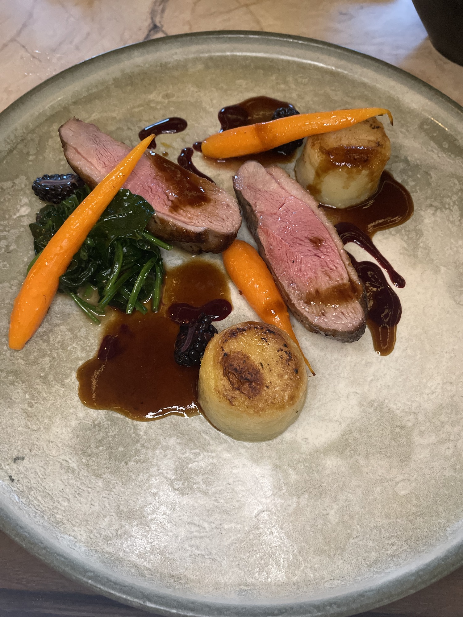 - ROASTED GRESSINGHAM DUCK BREAST (GF) buttered fondant, baby spinach, candied carrot, blackberry jus