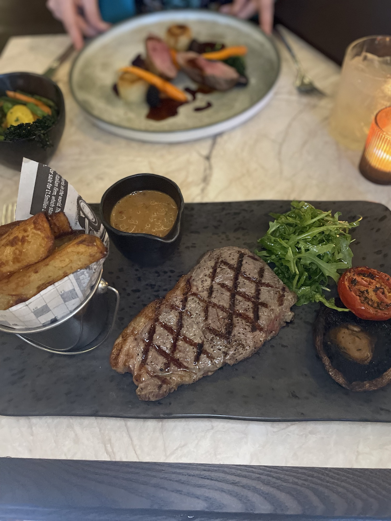 - 80Z SIRLOIN STEAK roasted plum tomato, Portobello mushroom, dressed rocket, triple cooked chips. all steaks are cut from 28-day dry aged Hereford breed beef, sourced locally in West & North Yorkshire through Sykes House Farm Wetherby