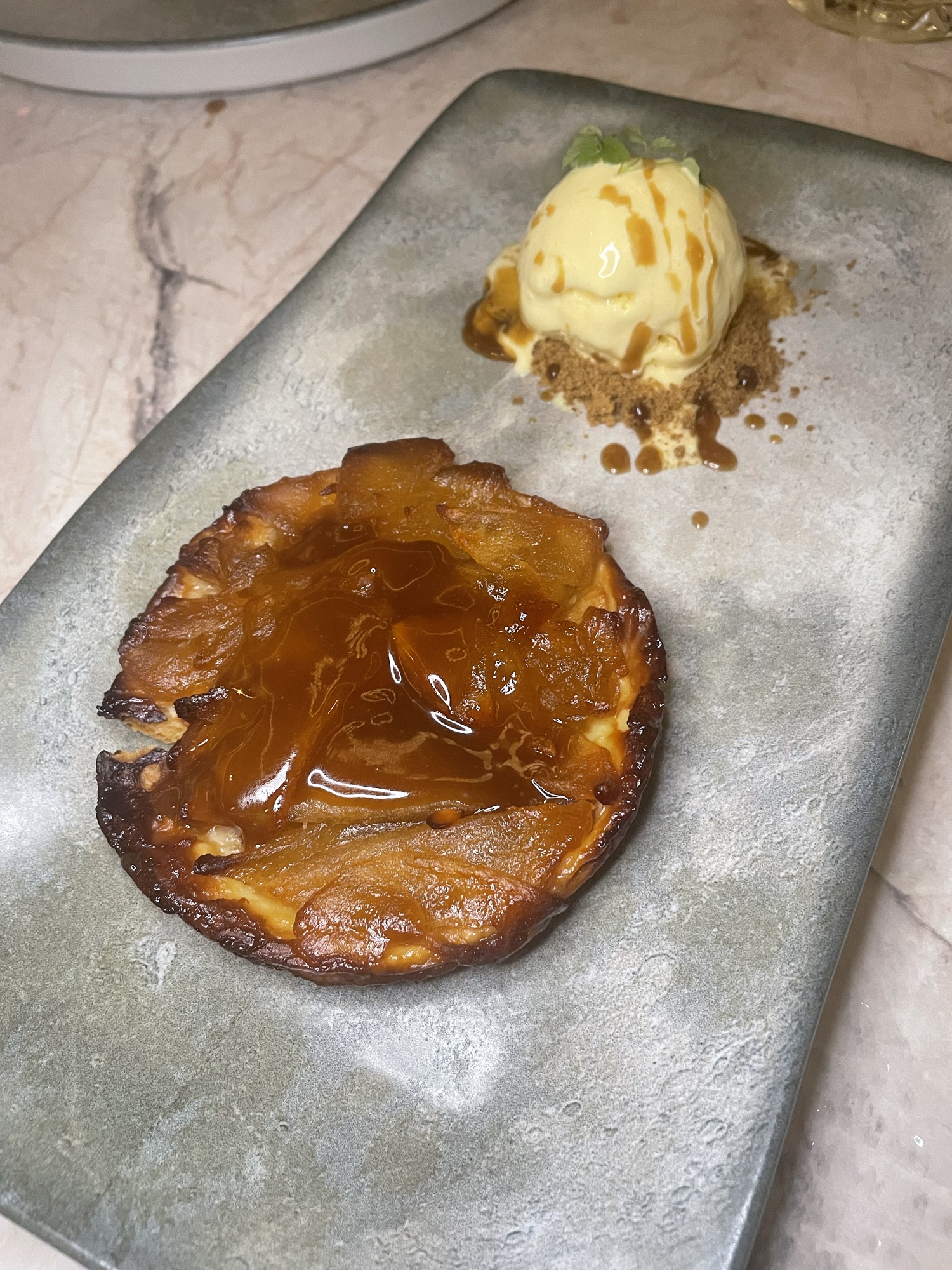 - GLAZED APPLE TART (V) caramelised Braeburn apples, flaky pastry, clotted cream ice cream