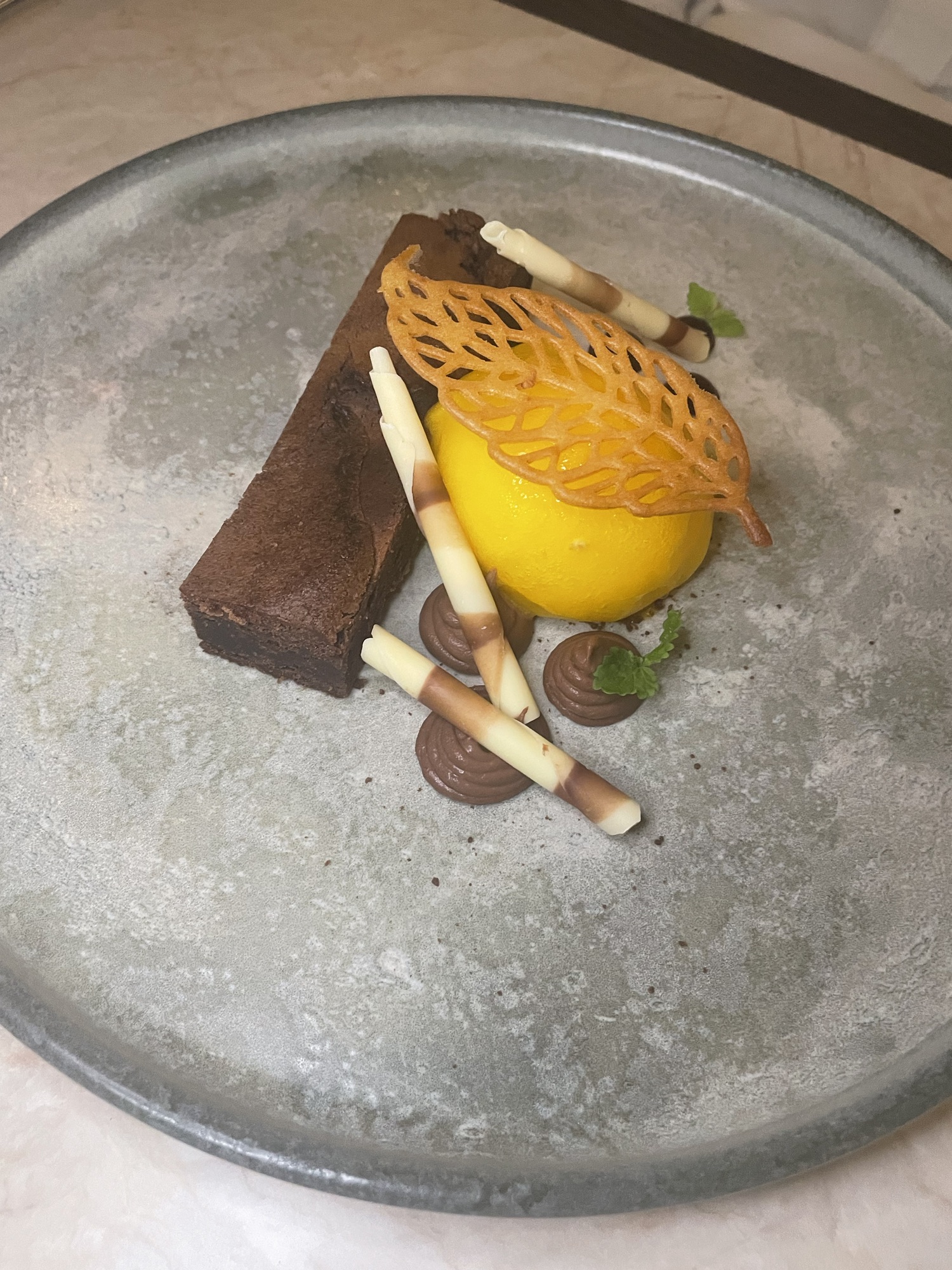 - VALRHONA CHOCOLATE BROWNIE chocolate mousse, orange sorbet, chocolate scroll, berry gel