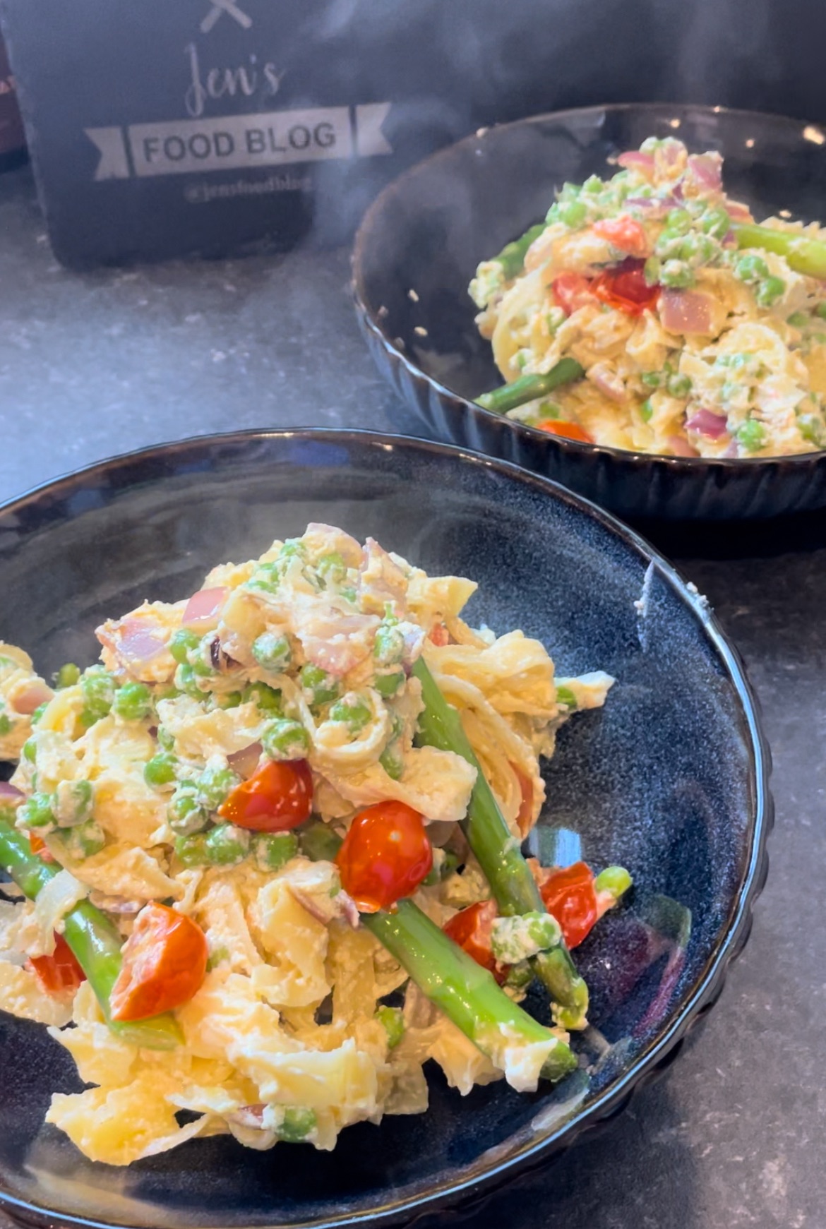 This recipe gives you a really fresh, healthy pasta dish that is great for a quick, Summer evening meal to make from scratch. I have also added things like veggie bakes or strips of cooked meat on top when I’ve wanted to add a bit extra, it is very versatile, however is still a really delicious Vegetarian meal as it is. Approx 400 cal per portion.