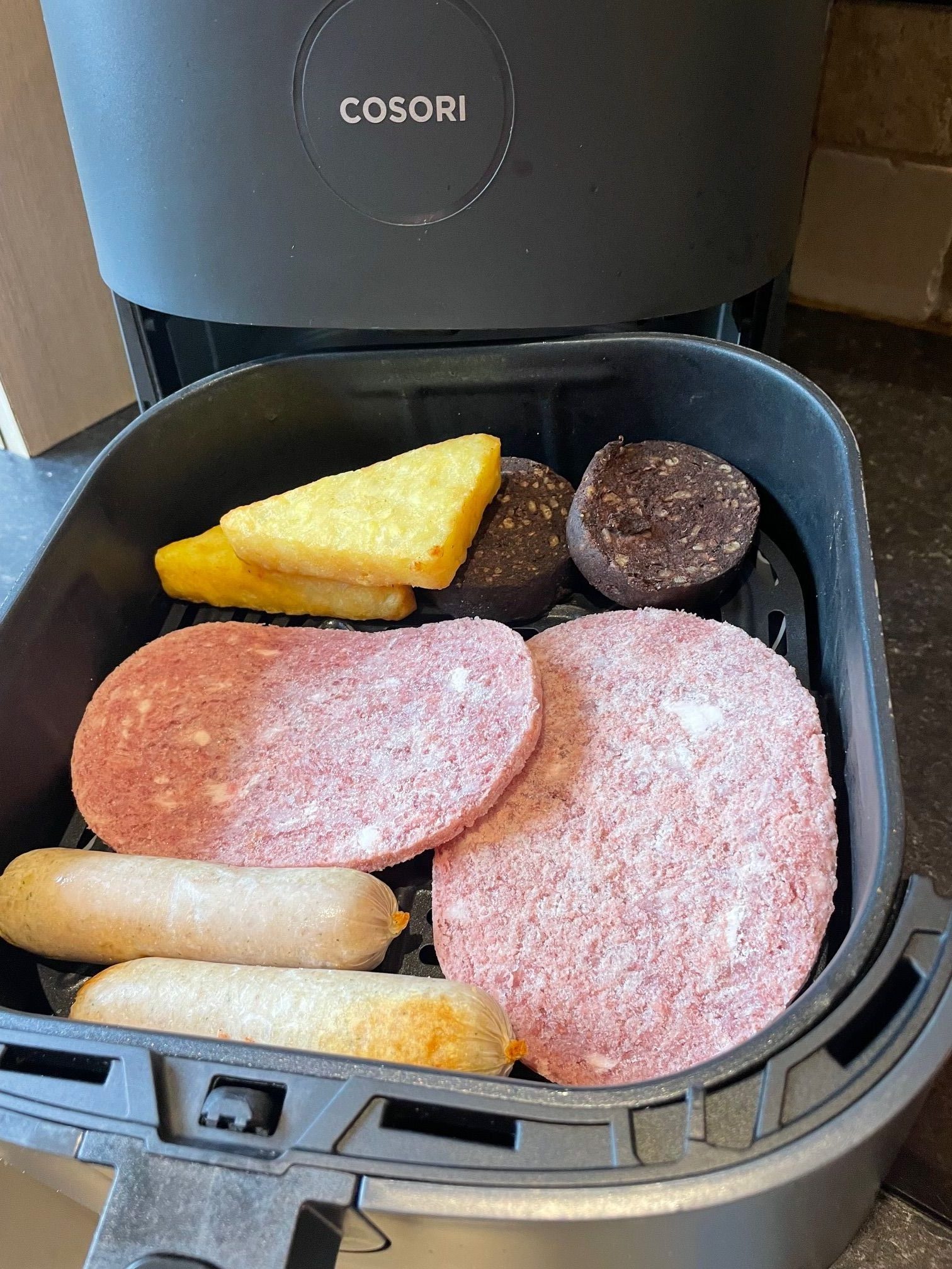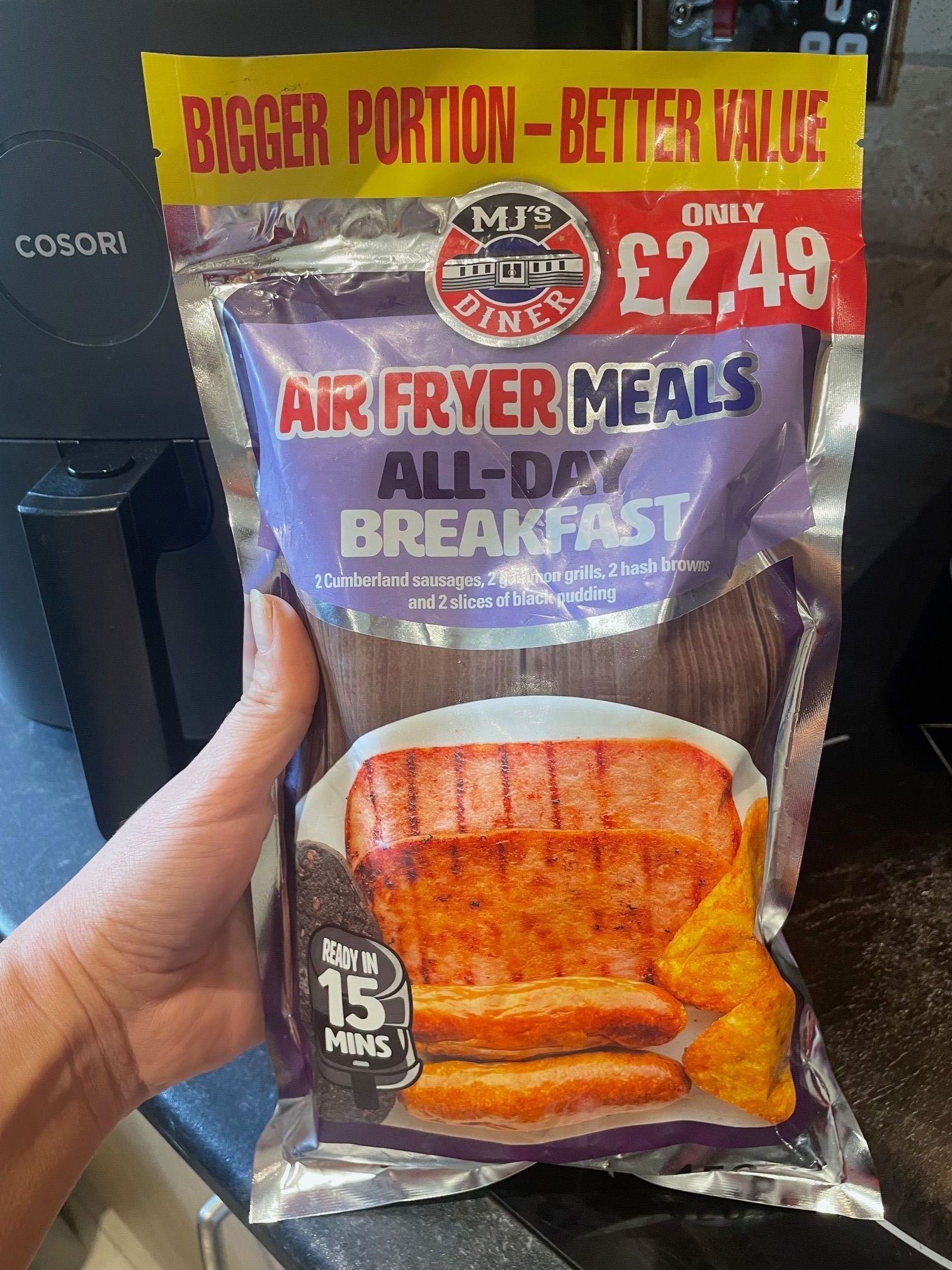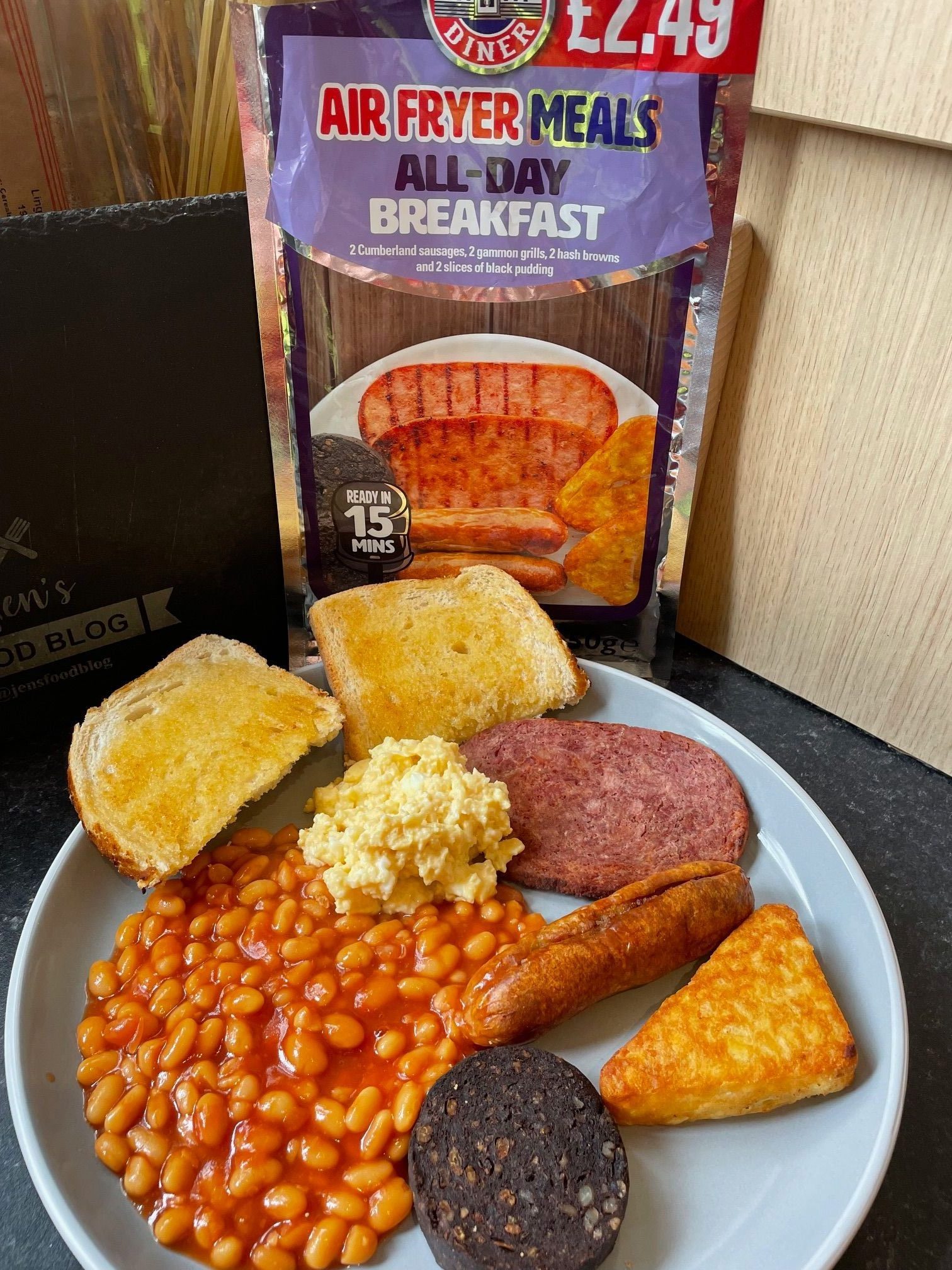 - All Day Breakfast – 2 Sausage, 2 Hash Browns, 2 Gammon Grill / Steak, 2 Black Pudding – I have to say we THOROUGHLY enjoyed this, it’s been my favourite meal so far form the range. All of the ingredients were tasty and everything came out of the air fryer crispy but soft in the middle. This is a great belly filler brekky for one person, or add beans, eggs and toast like us and its very satisfying for two. The easiest full English breakfast I’ve ever made.