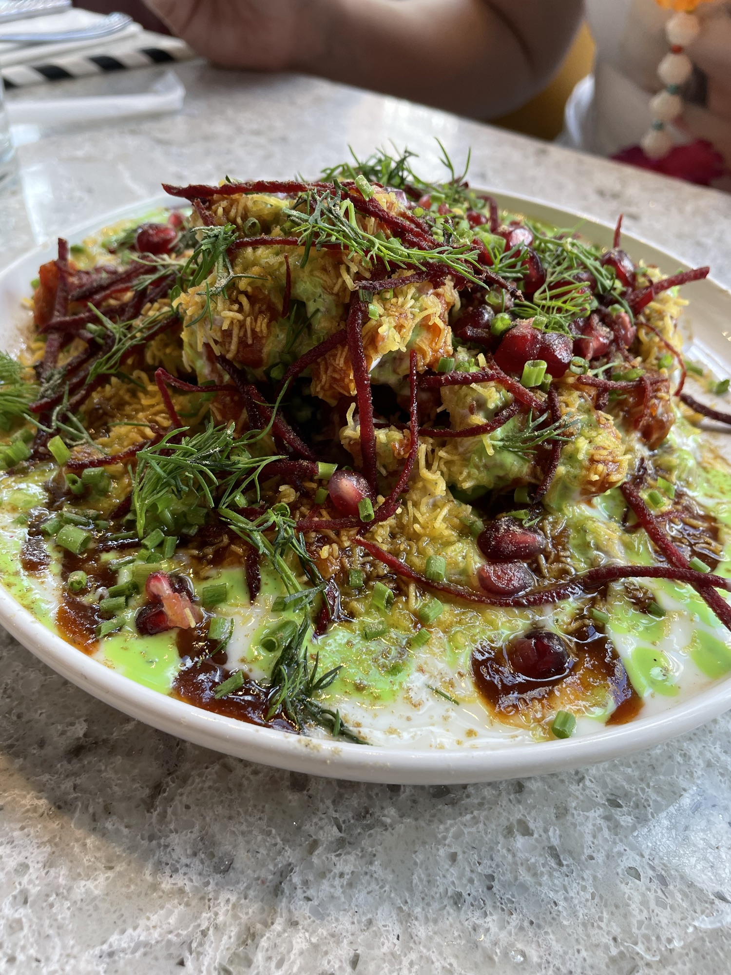 - Chicken 65 Chaat; Battered fried chicken tossed in a tangy spice & mint sauce β this was lovely but very filling! Lots of sauce and chickpeas.