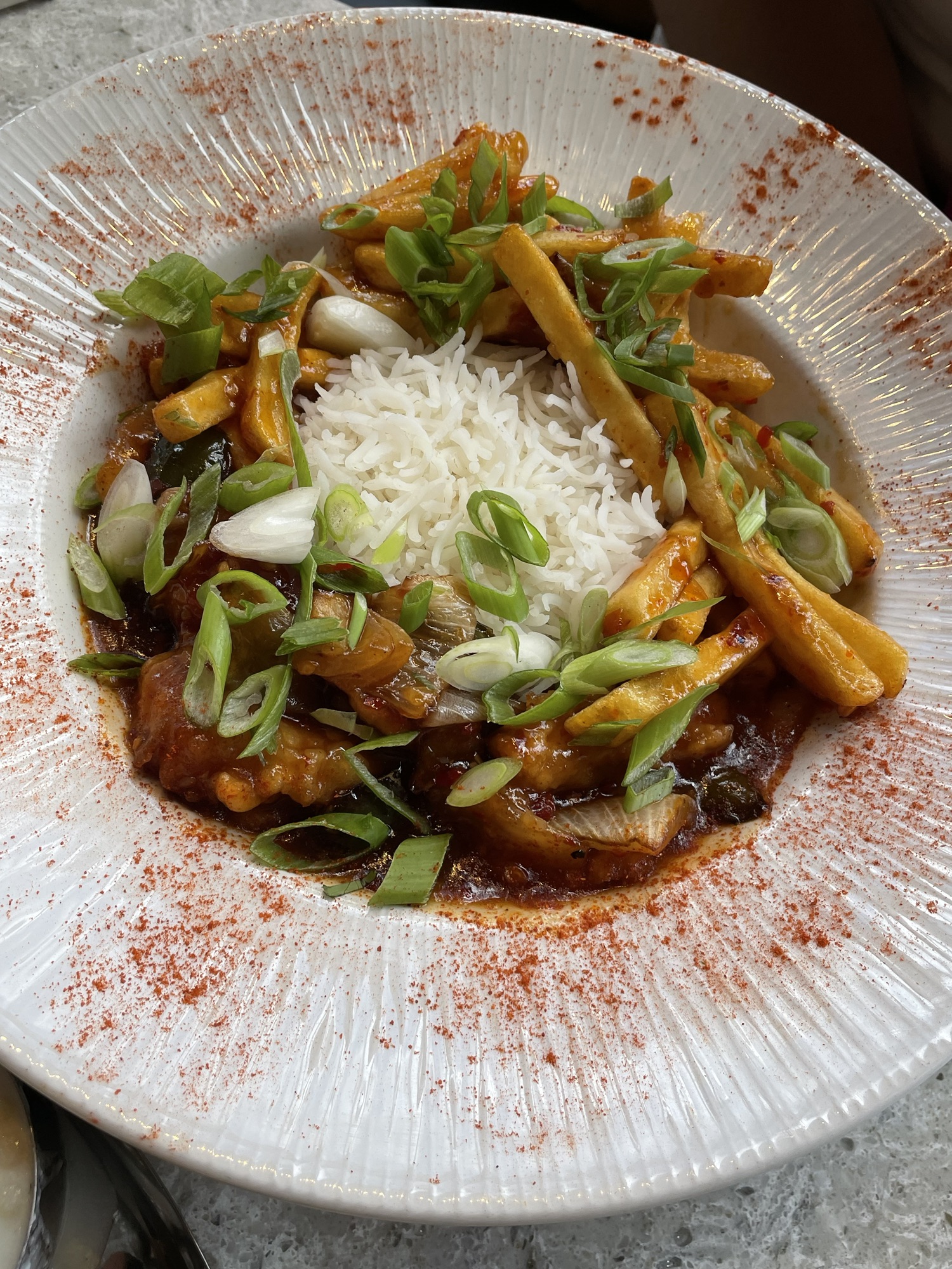 - Chilli Paneer with Rice & Honey Chilli Chips β watch out for the spice on this one, very hot indeed, but very flavoursome and delicious