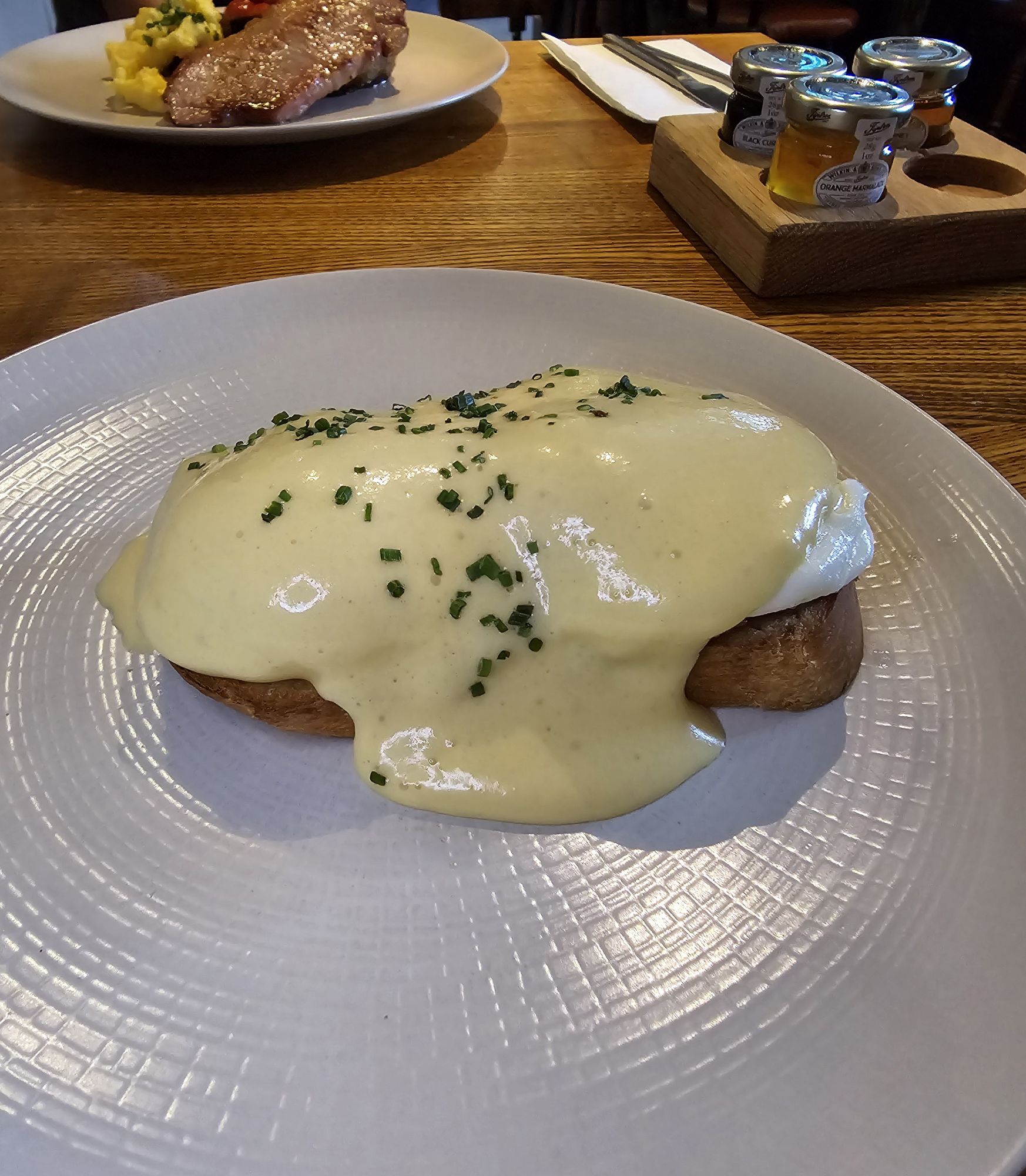 - Eggs Benedict (£14.00); 2 poached free range eggs with smoked bacon and homemade Hollandaise sauce on toasted Brioche – the yolk pop says it all, the eggs were for me pure perfection.