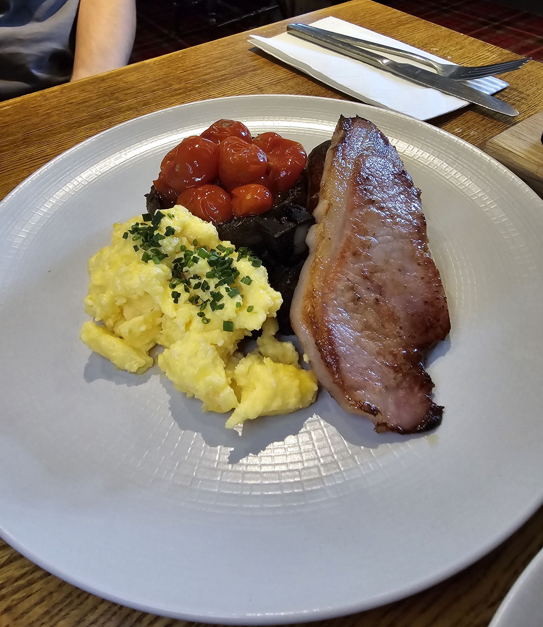- Full English (£15.00); free range scrambled eggs, prime pork Sausage, dry curry bacon, homemade black pudding, mushroom, tomatoes & baked beans with sourdough toast – the way the breakfast is presented is appealing & positively misleading, it looked a small portion but boy is it filling! The thickest cut bacon ever, lovely cubed black pudding, scrambled eggs made with cream. VERY good indeed.