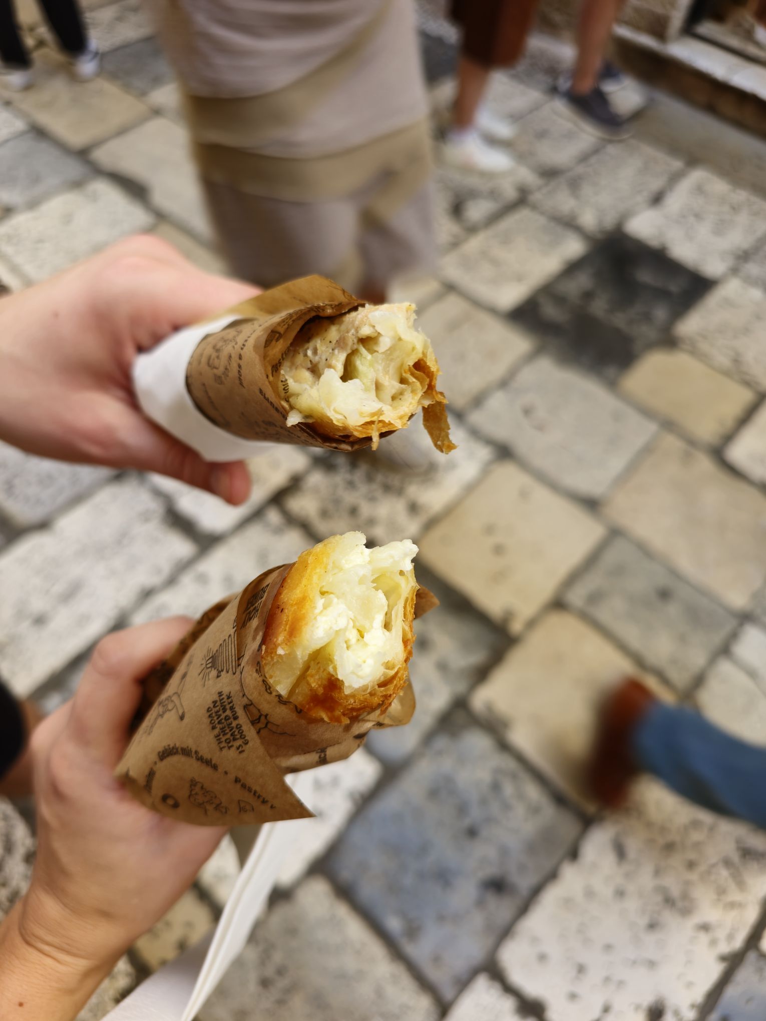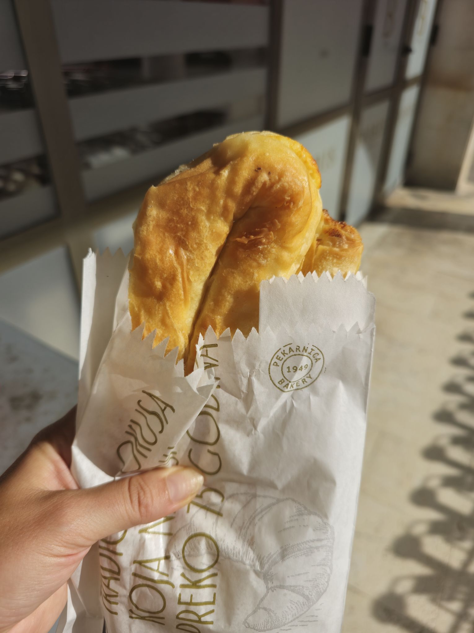 1 & 2. One of our favourite things was the amount of bakeries there are, all open until late. A few times we grabbed a pastry or pizza slice and took it to enjoy at a local bar – this is absolutely the life I want haha 🩵 But one of our fave foods of the holiday had to be Burek or Börek which is a pastry or pie found in Ottoman/Turkish cuisine. The pastry is made of a thin flaky dough such as filo with a variety of fillings, such as meat, cheese, spinach, or potatoes. My favourite was cheese but the chicken and leek one were particularly good too!