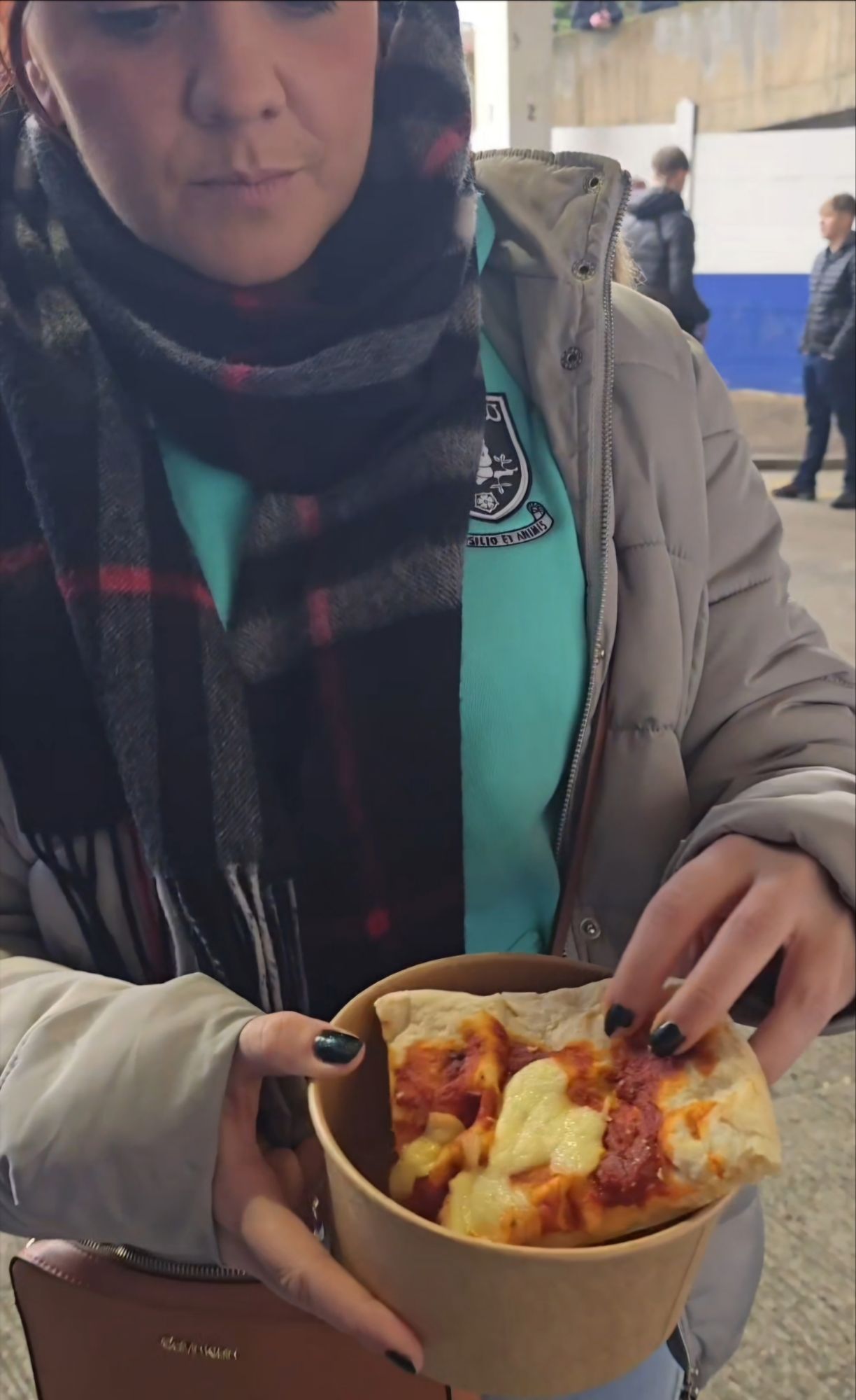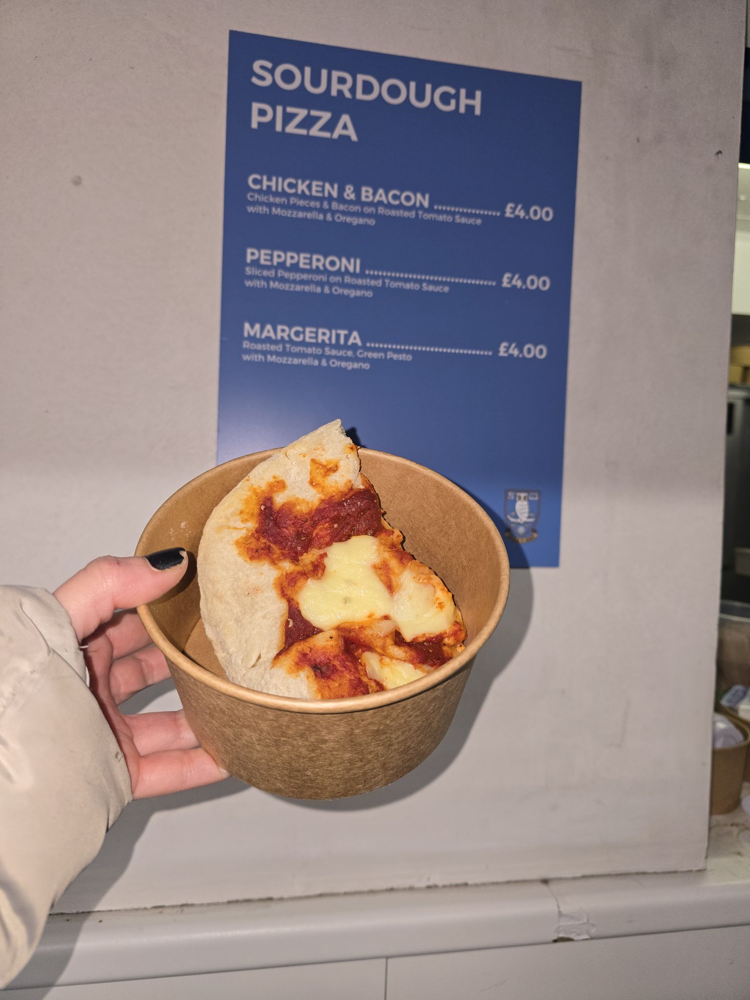 🍕🍛Next up we headed to the North Stand kiosks and first one we came to, we grabbed a pizza slice. We shared Margarita as Pepperoni had run out. A lovely pizza slice, great for a quick grab. I’d always take more cheese haha (£4).