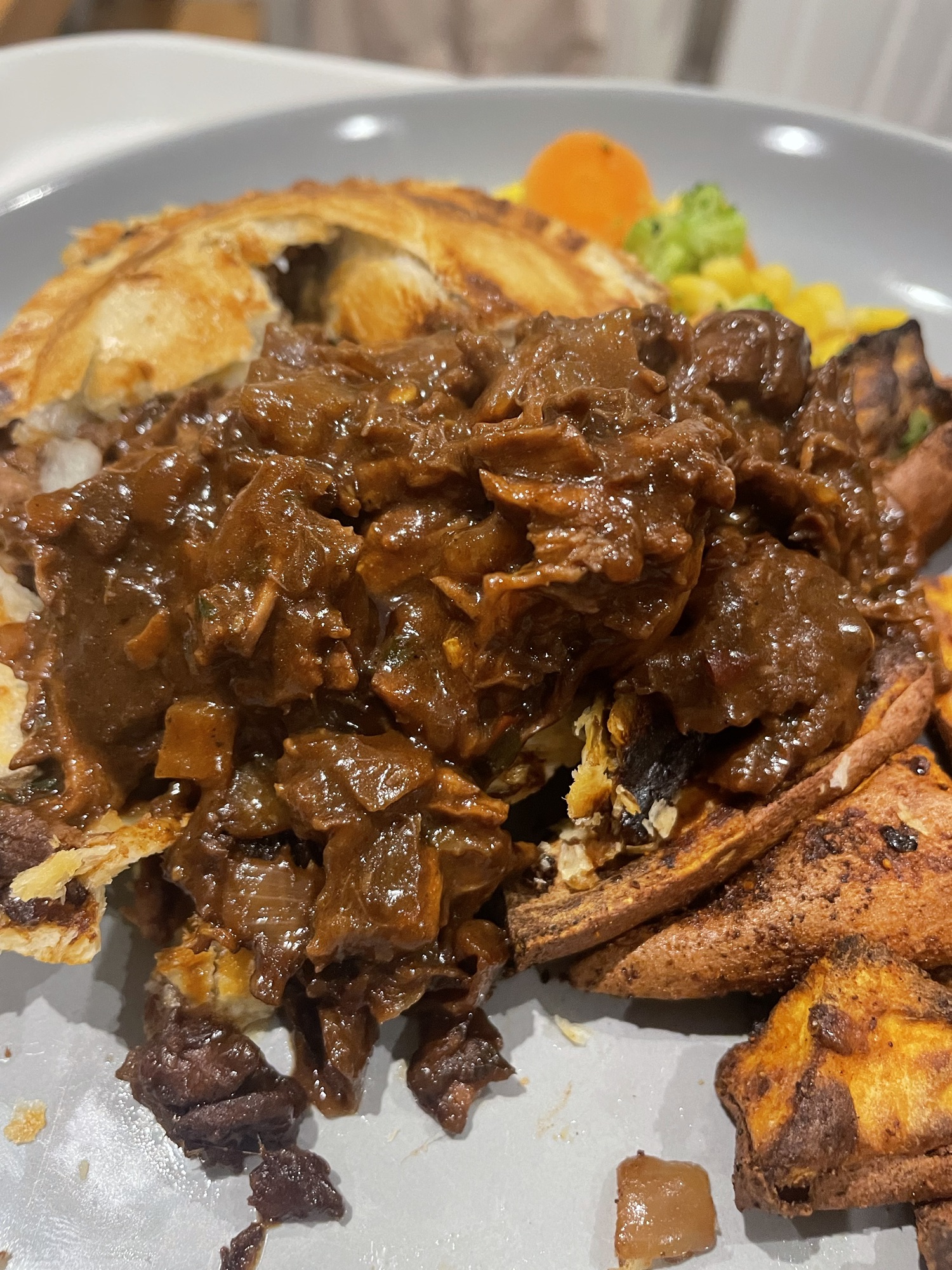 - Sticky Brisket of Beef without the Grief (pictured above)- we slow-cooked some rump steaks with the sauce mix and some garlic butter, and then made our own pies – bloody delicious. Their serving suggestion = 318 cal/55.5g protein per portion
