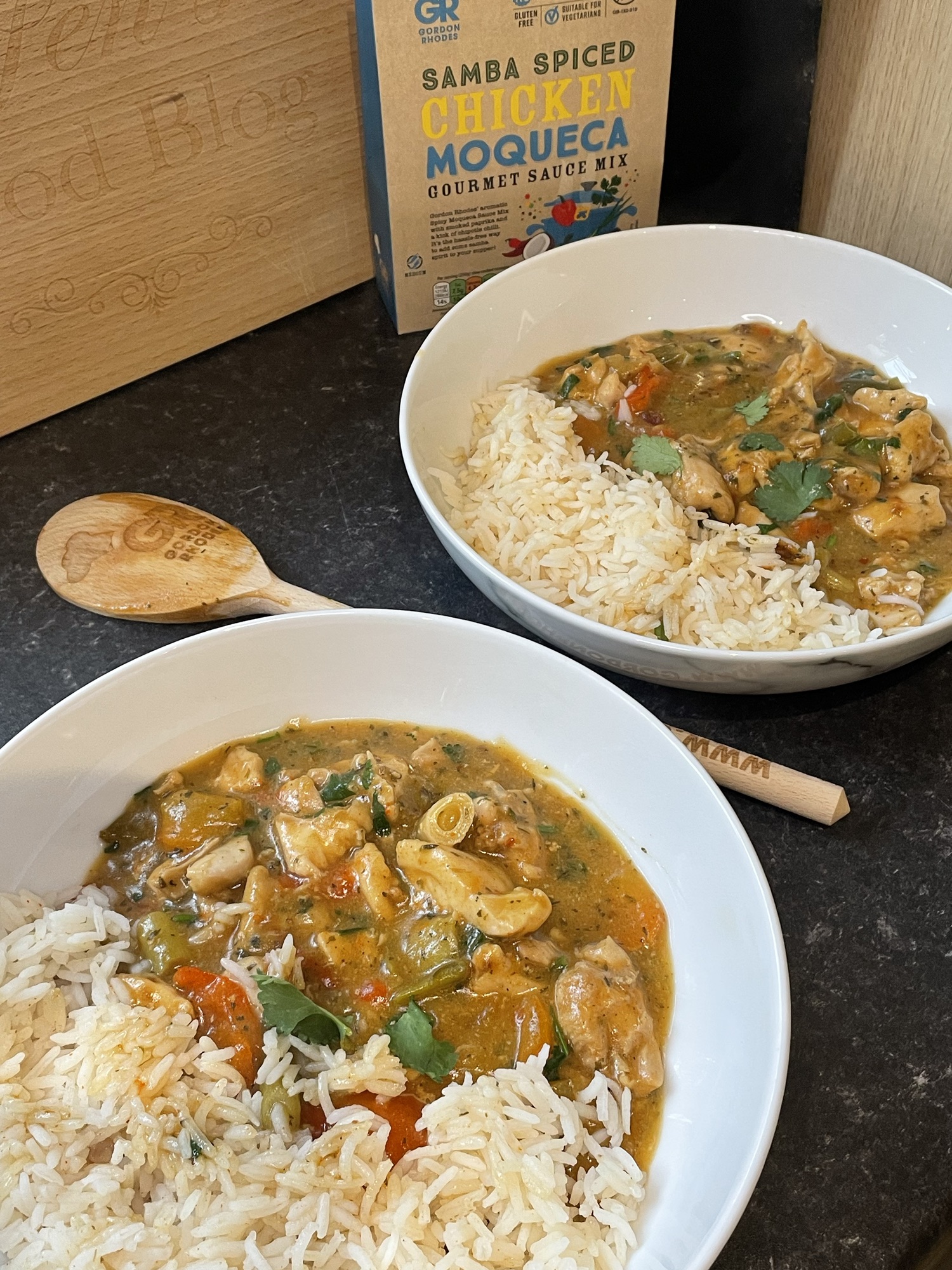 - Samba Spiced Chicken Moqueca (Brazilian type casserole/stew – pictured below) – I used their serving suggestion and we had rice on the side – it was so mouth-wateringly tasty = 288 cal/45.8g protein per portion (without the rice obvs)