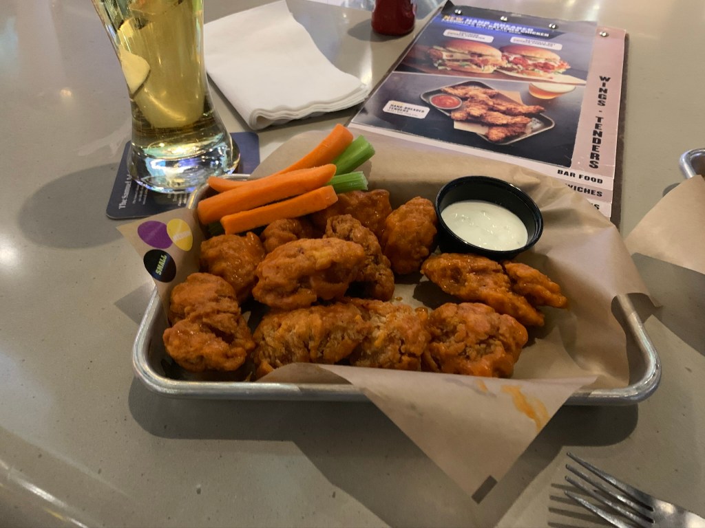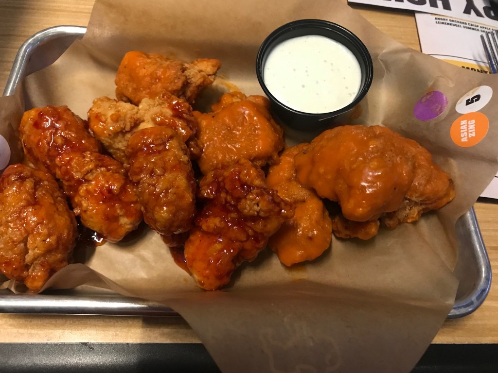 A firm favourite chain of mine whenever Iβve visited America has to be Buffalo Wild Wings. I came across this place when I travelled to Florida years ago, and have been a big fan ever since. Itβs basically a sports bar and a fast-food restaurant rolled into one, Serving chicken wings with different flavoured and different levels of spiced sauce. You can choose from boneless wings or on the bone, and sauce flavours such as buffalo (medium or hot), Honey BBQ, Bourbon Mustard, Asian Zing, Jerk and so on.Β As I love spicy food and can tolerate chilli a fair bit, Iβve tried the Buffalo Hot and the Asian Zing. Yes I do struggle towards the end of the wings, my mouth is on fire, but they are so tasty and worth it! Warning β when they say hot they MEAN hot. And they also serve typical American-sized portionsβ¦a βsmallβ is 10 chicken wings!! Located in the middle of the strip behind McDonalds, I recommend trying here, let me know what you think.