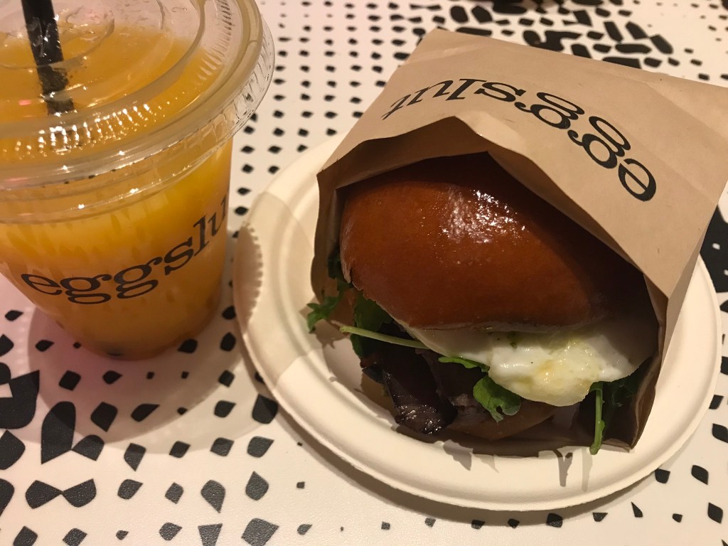 Eggslut β Cosmopolitan Hotel. Quirky gourmet food concept inspired by the love of eggs.Β Enjoy your food in an Alice in Wonderland themed dining area Down the Rabbitholeβ¦Recommended dish;Β GAUCHO. Seared wagyu tri-tip steak, cage-free over medium egg, chimichurri, red onions and dressed arugula in a warm brioche bun.