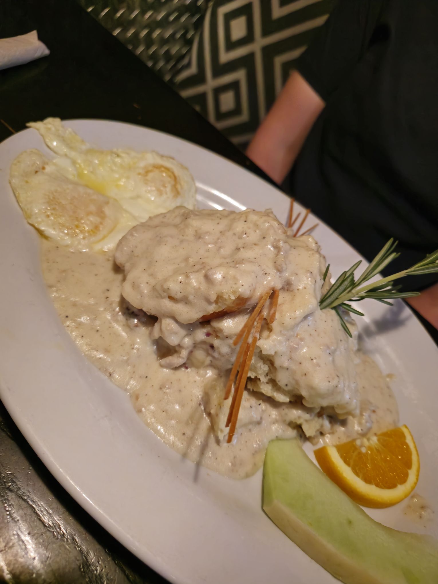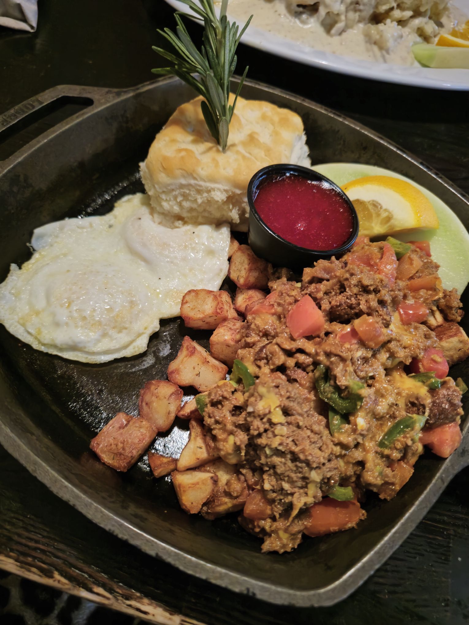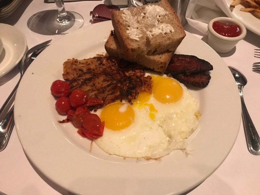 We also visited Hash House a Go Go in The Linq for breakfast on our most recent trip (November 2024), after seeing good things about it β the breakfasts here are RIDICULOUSLY HUGE! I was the usual hungover, but I managed to enjoy a famous βHashβ. I went with the Chorizo, Jalapenos, Cheddar Cheese & Fresh Tomato Hash (this bad boy had a bit of a kick to it!); all hashes are served in an old fashioned cast iron skillet on a bed of crispy fried potatoes, with 2 eggs, homemade biscuit, fresh fruit garnish and finished with a signature rosemary garnish. There was a LOT of food in front of me, unfortunately I couldnβt manage it all, but it was good. Ben thoroughly enjoyed his Biscuits and Sausage Gravy β 2 eggs, griddled mashed potatoes, homemade biscuit and sausage gravy. The place was busy, however for just the 2 of us there was no wait time for a table.