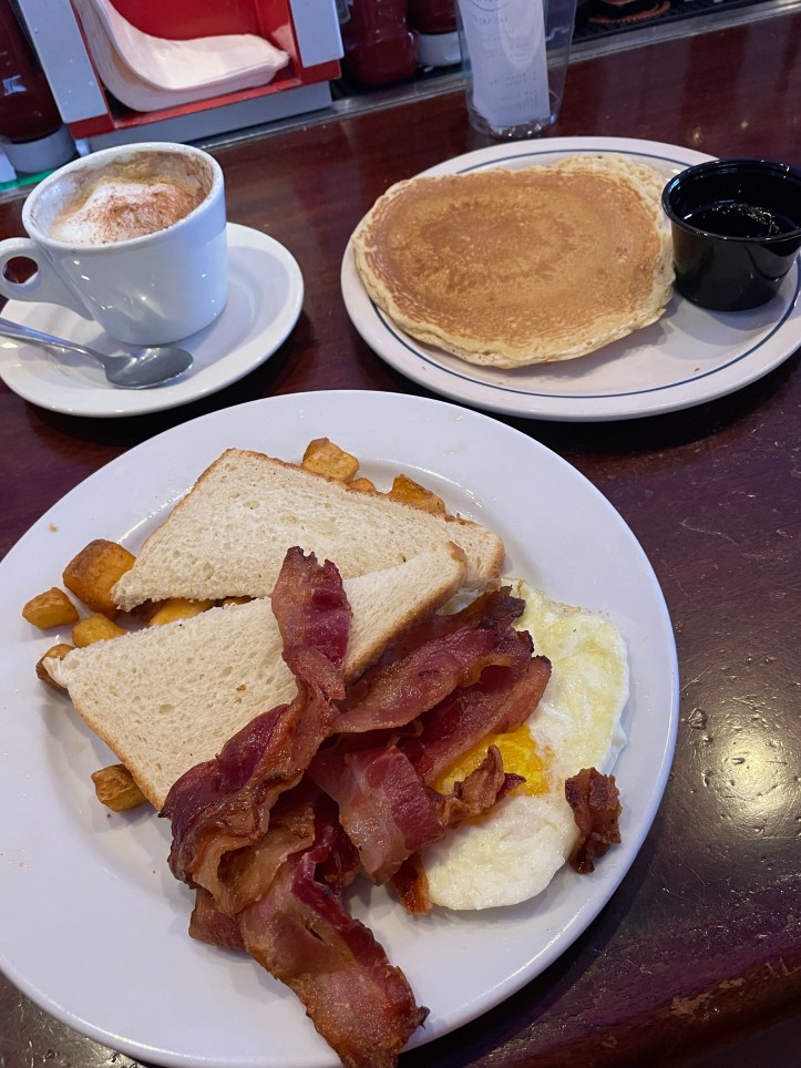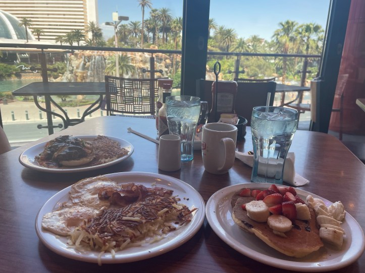 Breakfast spots β when visiting America you canβt not try Dennyβs. A fast food breakfast joint, who wouldnβt love that? Well I do haha (Although I am a fan of a few of these breakfast chains like i-hop and omelette house to be honest!). My go to was Hash brown, eggs and bacon with a side of pancakes, my ultimate favourite American breakfast! Be prepared to wait for a table though, for 2 people I think we only waited 10/15 mins so that wasnβt too bad. There are a few Dennyβs along the strip. Another great place we found for a quick breakfast was Ocean One within the Miracle Mile shopping precinct in Planet Hollywood. We pretty much got a table straight at the bar and enjoyed eggs, potatoes, lots of bacon and another a side of pancakes for me of course.