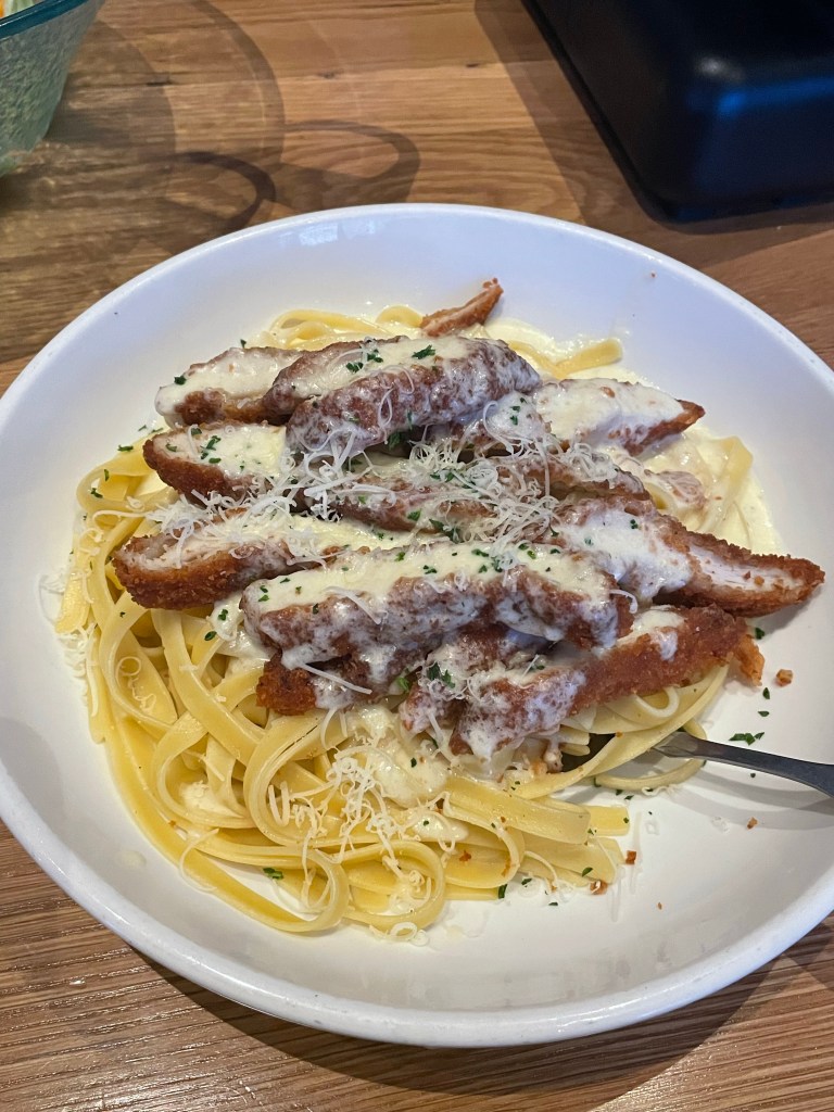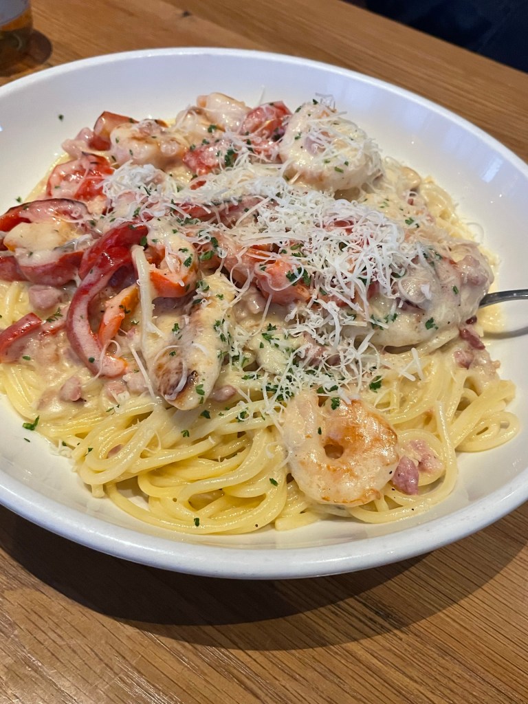 Olive Garden β again this is chain restaurant but if you like MASSIVE portions of pasta for very reasonable prices (not much of that in Vegas), then this is the place for you. I would say though that it is sad that a lot of food will most likely go to waste from this restaurant because the portions are that big, you should get a choice of a smaller portion really as I hate food waste. You get a free side salad with βbreadsticksβ or as I would describe them, baguettes lol. I went with Crispy Chicken Alfredo β the creamy sauce was very rich so I got very full very fast. Ben enjoyed the Chicken & Shrimp Carbonara. We didnβt have to book and got a table straight away. Olive Garden is based in the same building as Brewdog, near the Coca Cola store on the strip.