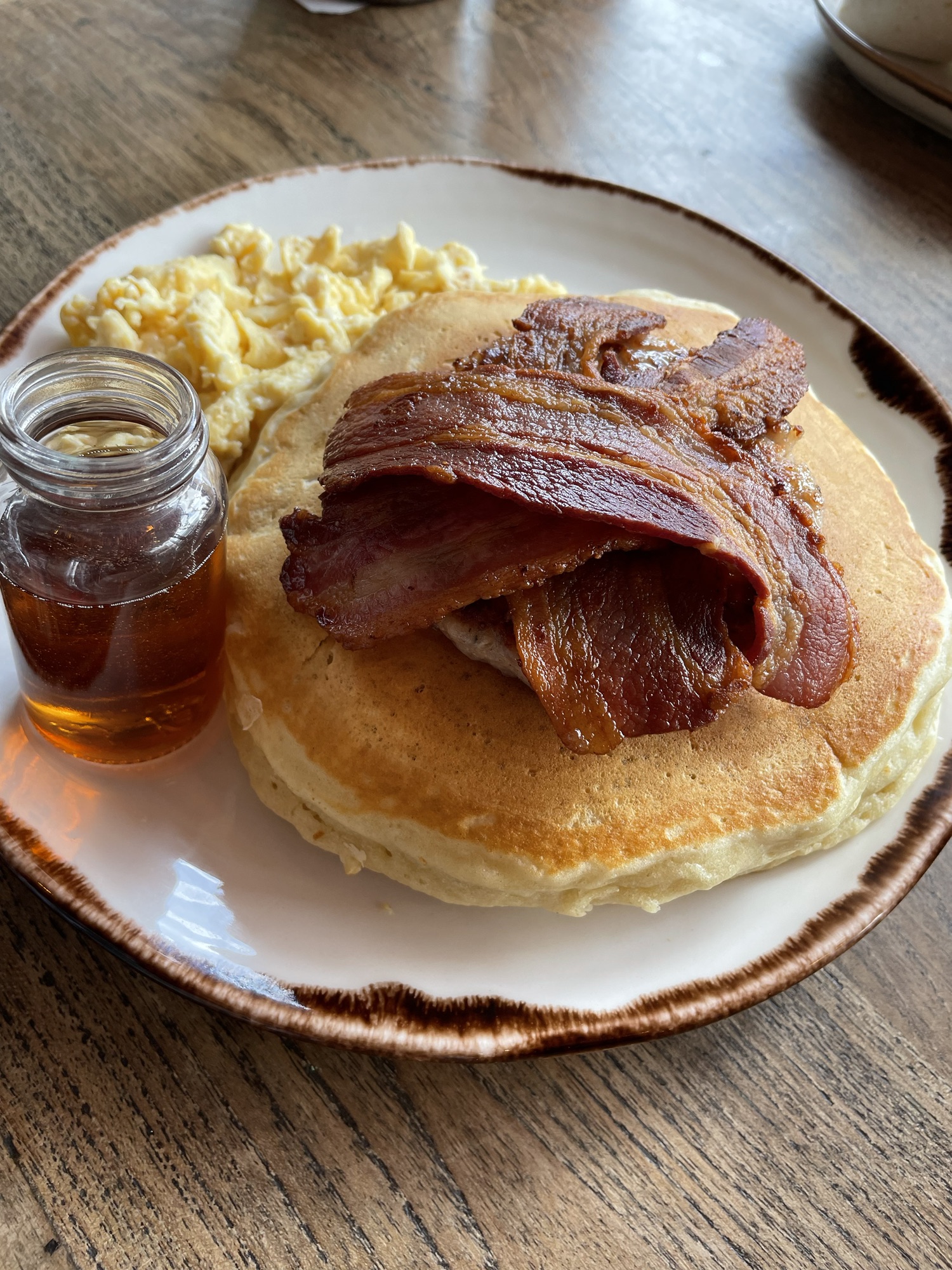 - The Works *Signature Dish* (£9.95) – 2 pancakes (or swap for waffles or french toast) topped with Sausage Patty, streaky bacon and scrambled eggs with maple syrup – this was the ultimate breakfast feast and was absolutely delicious. You HAVE to drizzle the maple syrup on this one for full effect.
