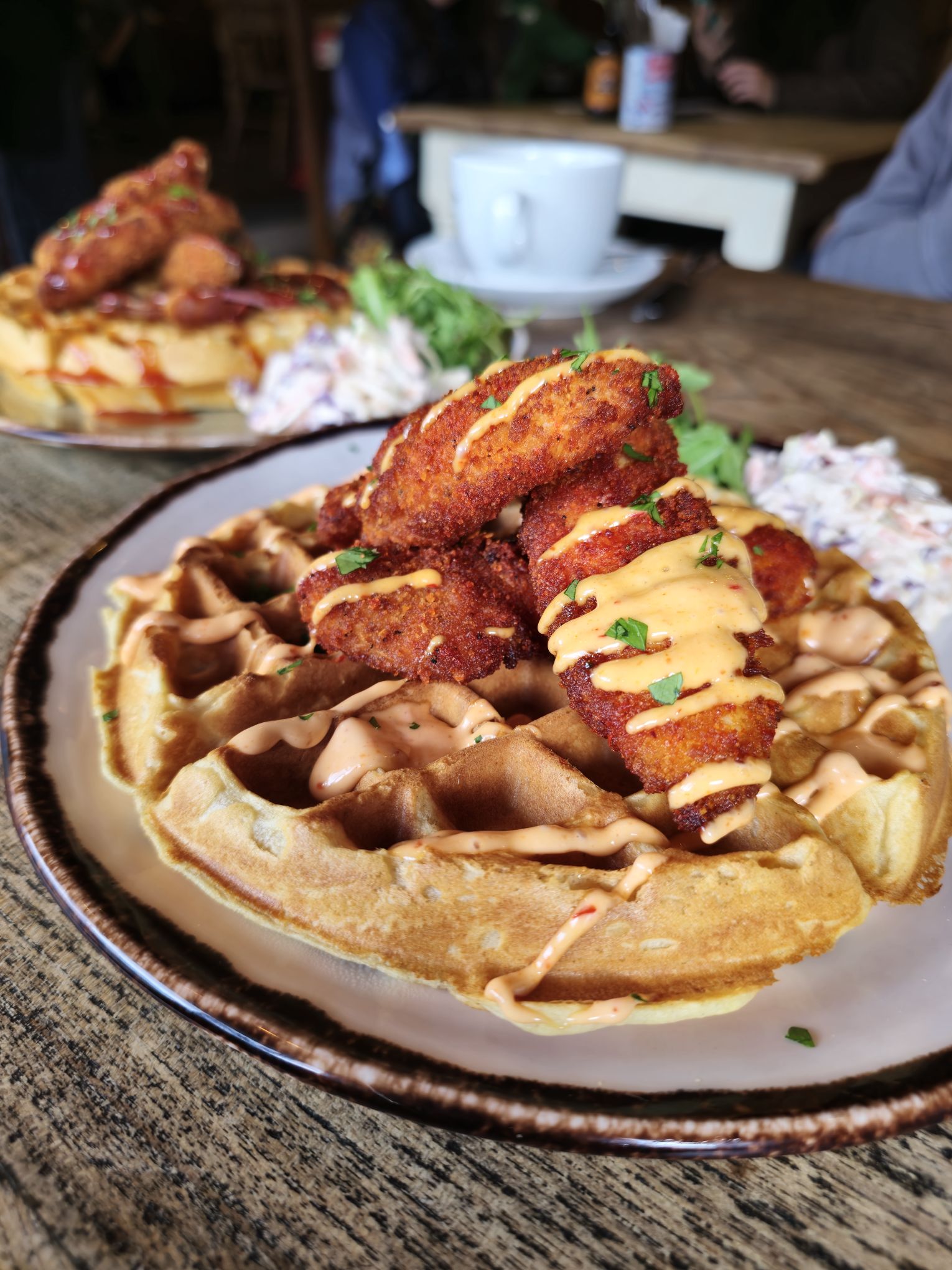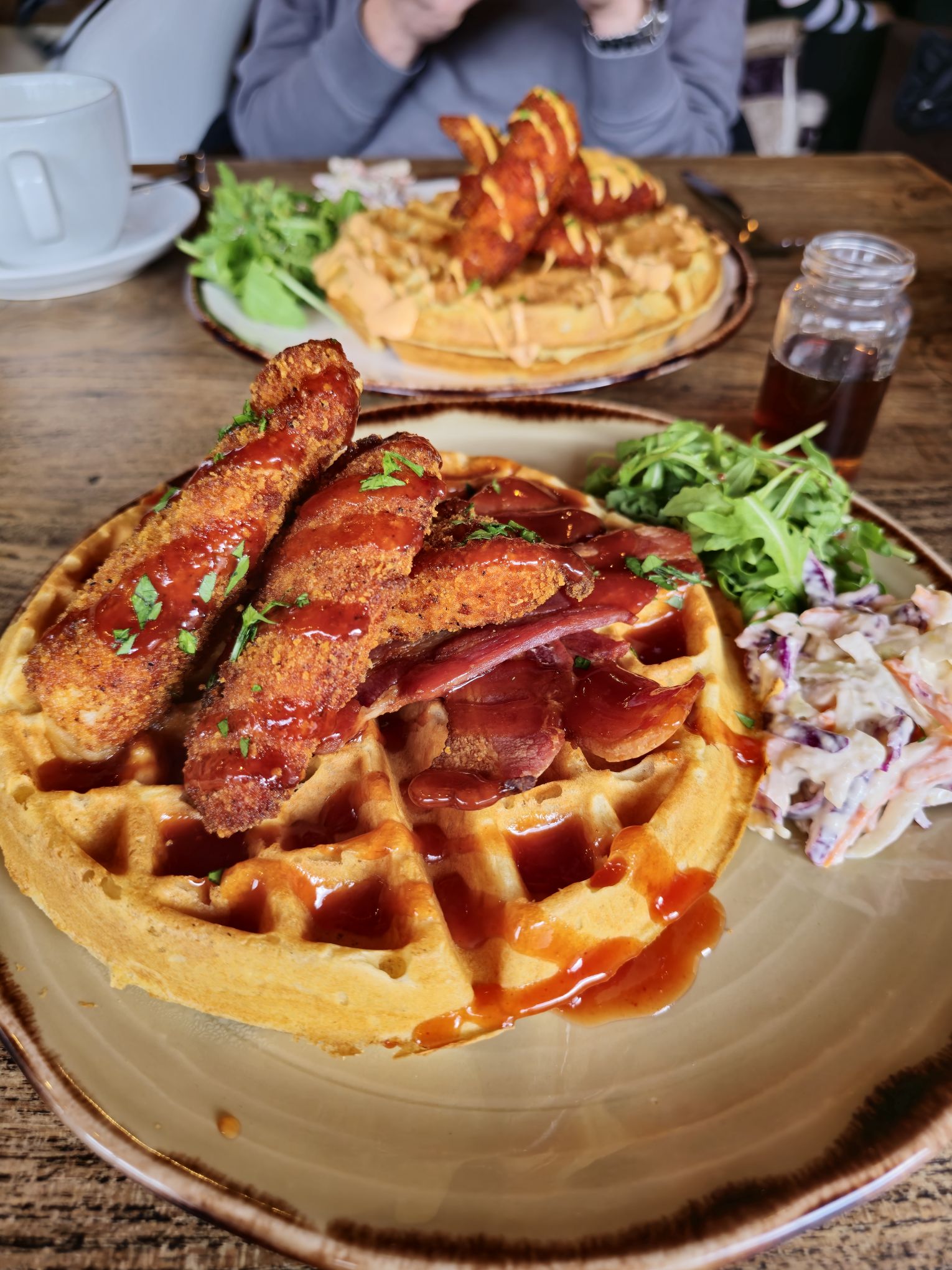 - Sriracha Spiced Fried Chicken Waffles with Sriracho Mayo (£11.95) *and why not add some ranch sauce?* – lightly spiced giving a bit of heat & a slap of garlic, great for the spicy, savoury brunch lovers. Served with Fresh Slaw and rocket. The chicken is fresh, crispy, and so succulent.