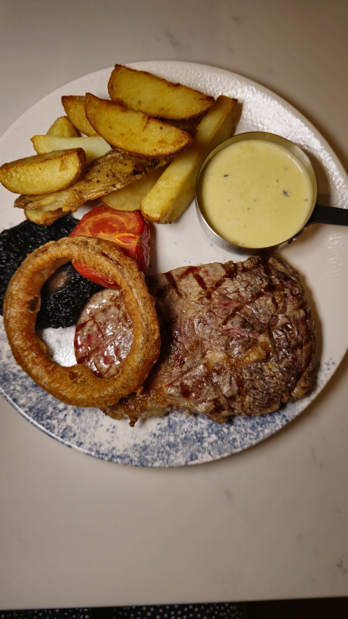 - 10oz Ribeye Steak (medium rare) & Blue Cheese sauce, with triple cooked chips, roast mushroom, grilled tomato and homemade onion ring. ️Ben loved this, everything cooked to perfection. The sauce was quite a creamy one, so even I liked it! (not big on blue cheese myself)