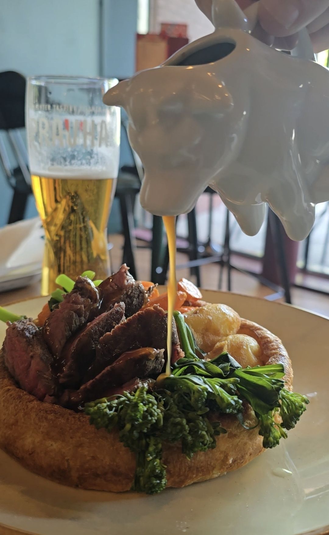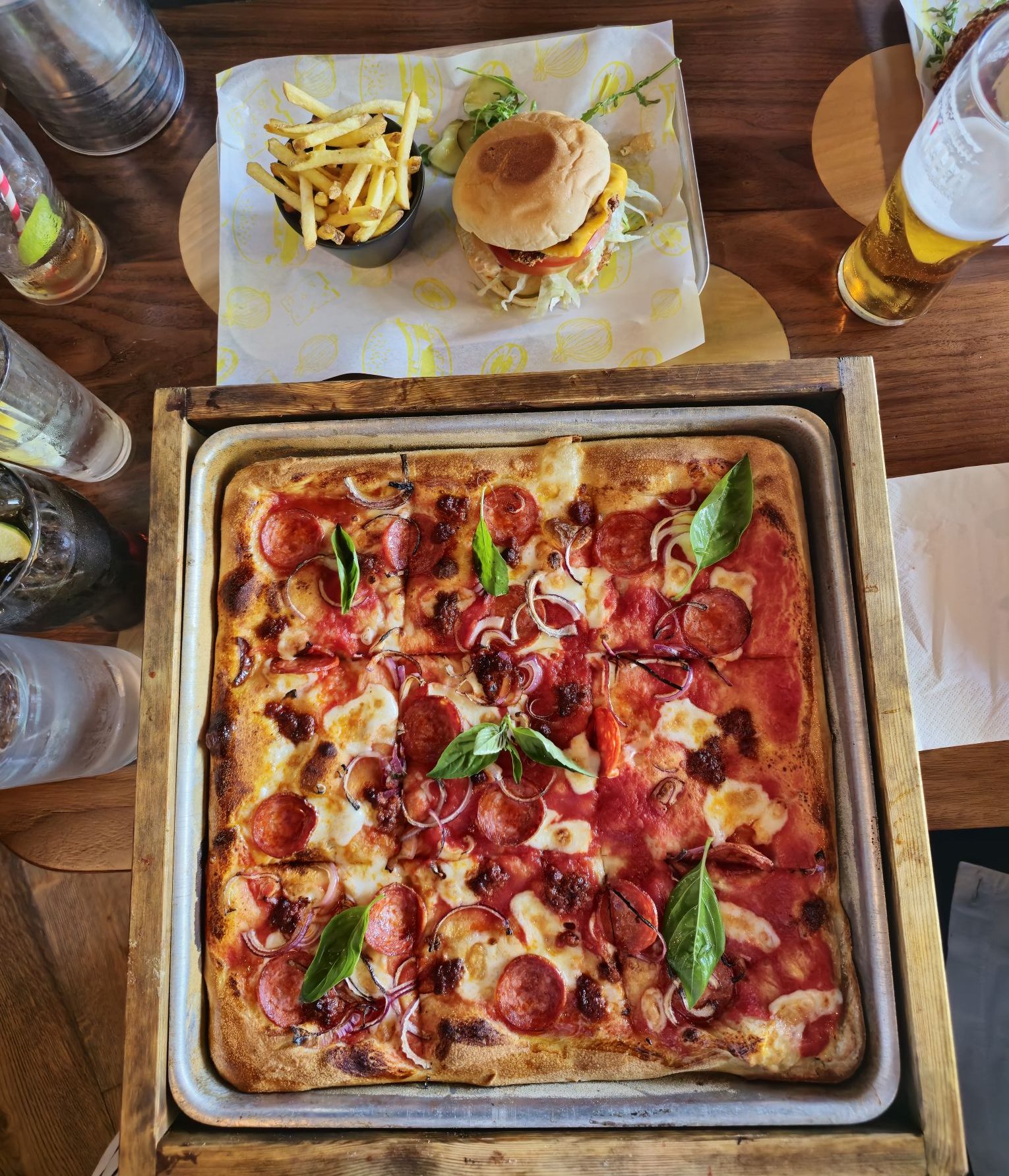 The food consists of sharers, burgers, pizzas to share, and on Sundays you can get a steak roast dinner, served in a giant Yorkshire. I really wanted pizza, but Ben really wanted a Sunday Dinner, and my friends opted for the burgers. So yeah… I had a pizza to share, just for myself… and it didn’t even fit on the table. But it was good, and I took home leftovers!! The food was decent.