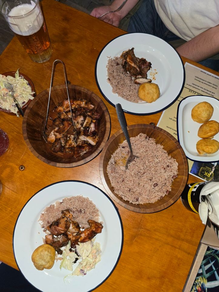 - Jerk chicken, rice & peas, dumplings, slaw & jerk gravy.