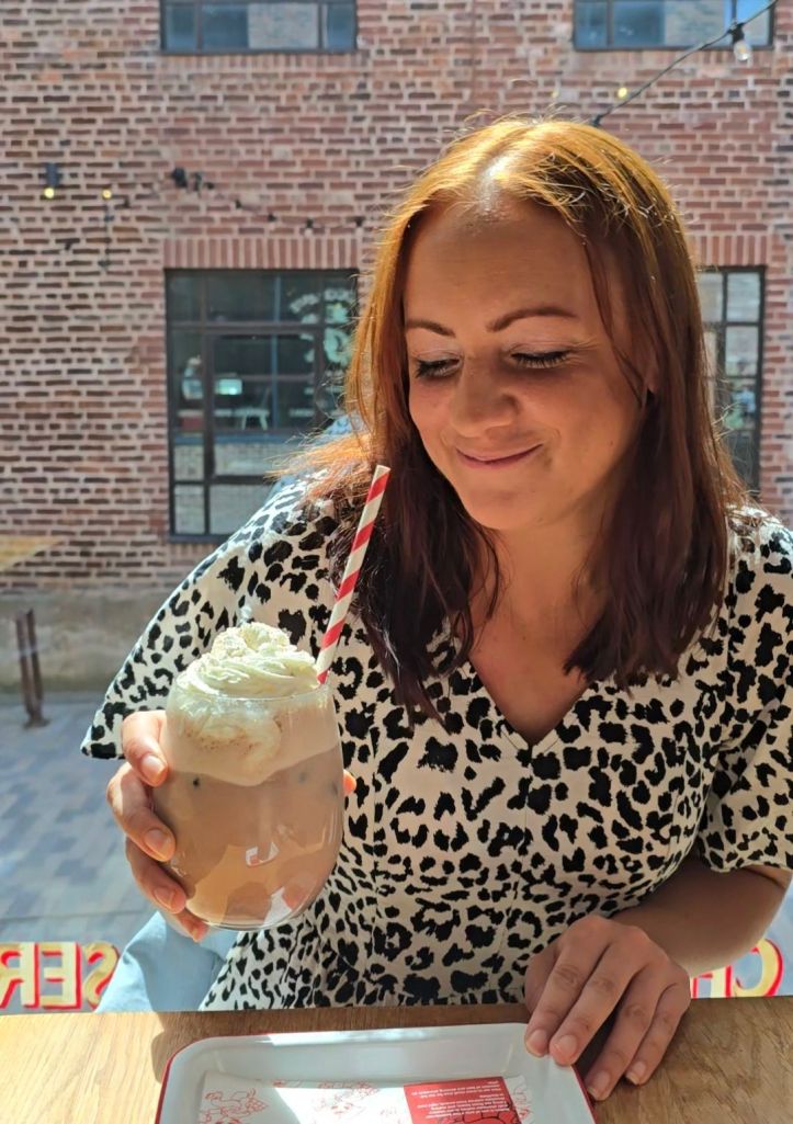 - Sophie went with the iced 70% dark oat milk with vanilla flavouring and couldn’t resist the whipped cream either.️