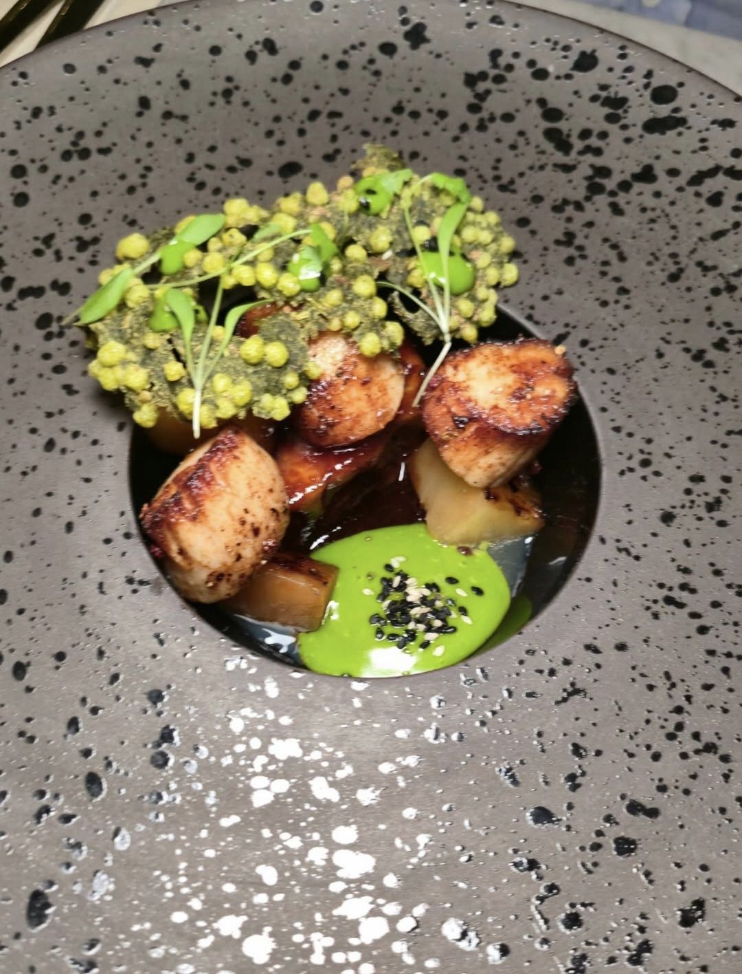 - Salt ‘n’ Pepper king scallop with char siu pork belly, hot & sour pineapple